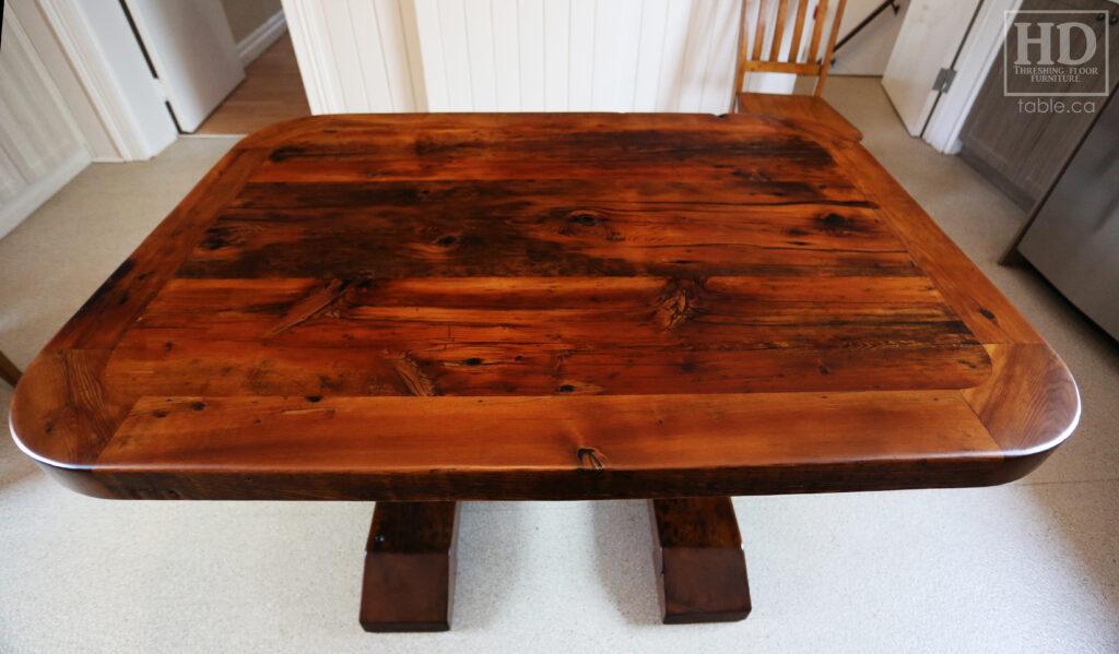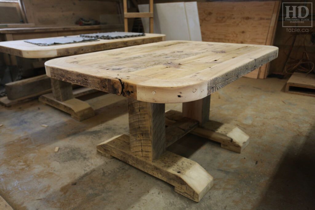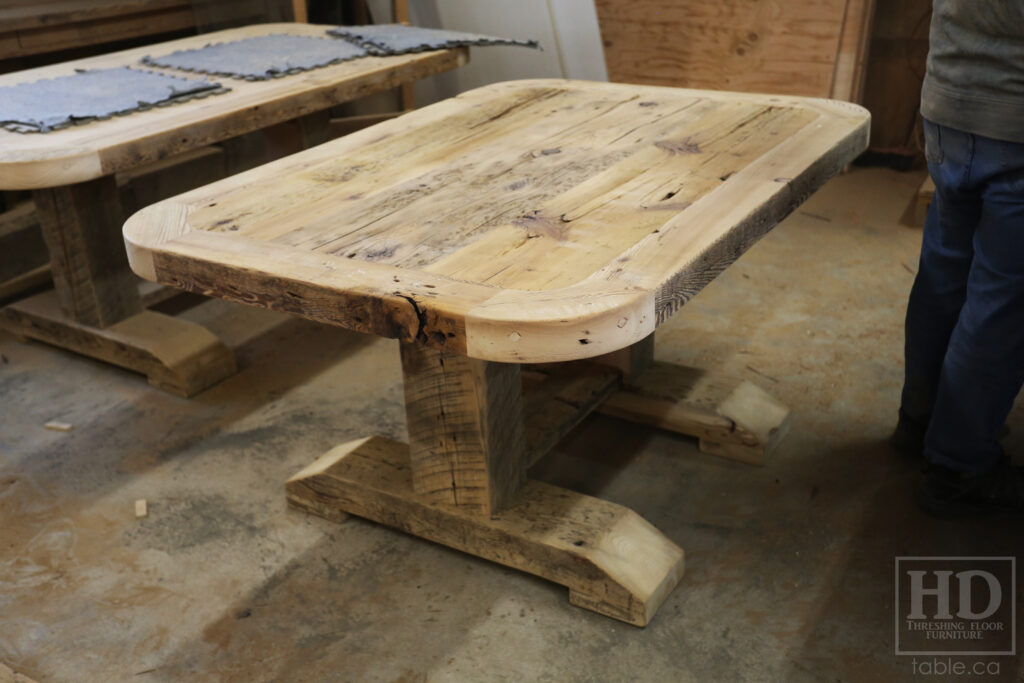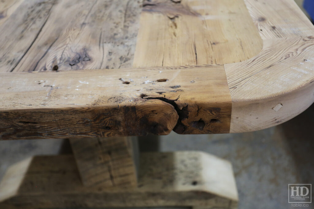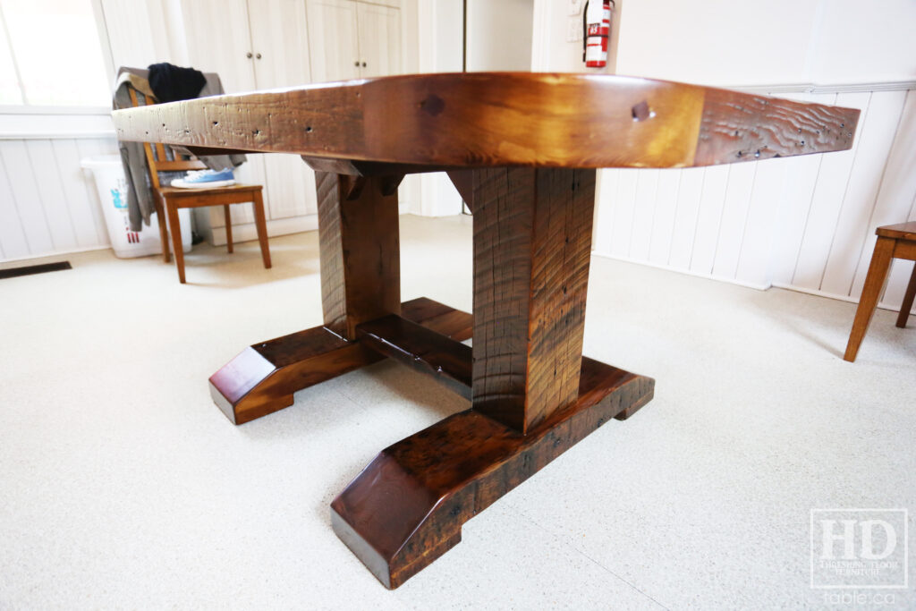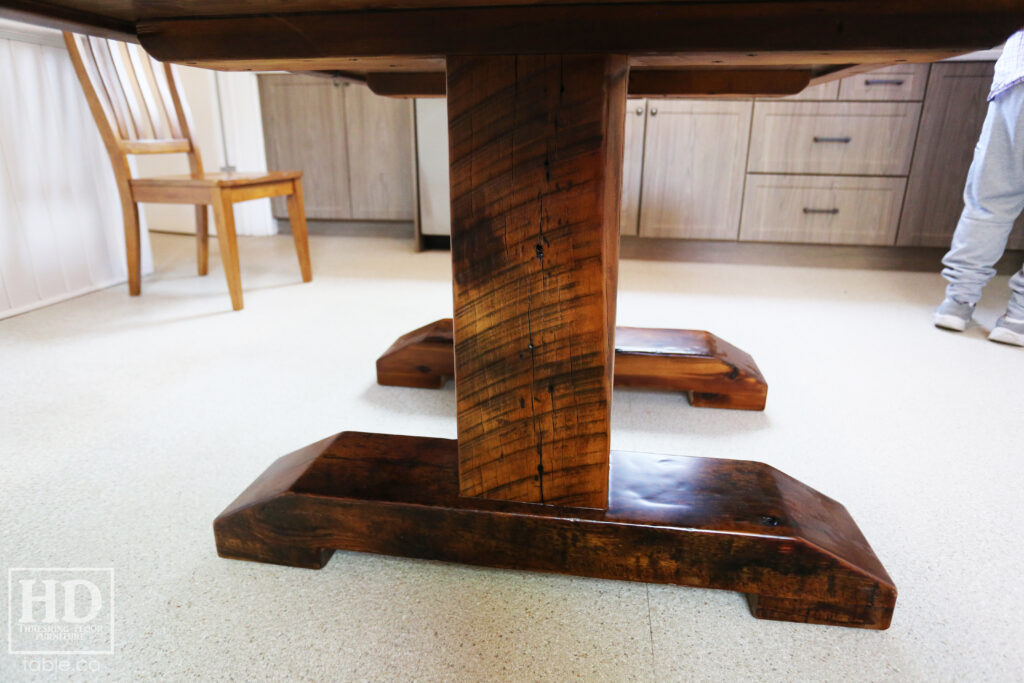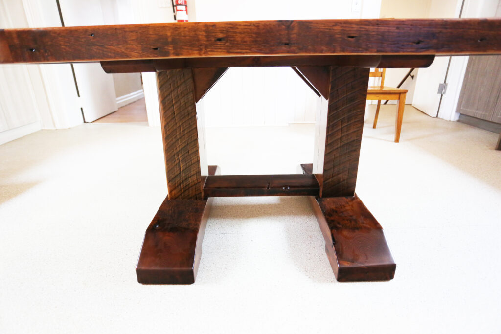 Project summary: 60″ Ontario Barnwood Table we made for a Port Hope office – 42″ wide – Extra thick 3″ top option – Hand-hewn Pedestals Base with rail – Old Growth Reclaimed Hemlock Construction – Original edges + patina kept – Rounded Corners Option – Epoxy seal on base option – Premium epoxy + satin polyurethane finish – www.table.ca
