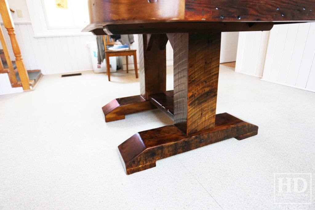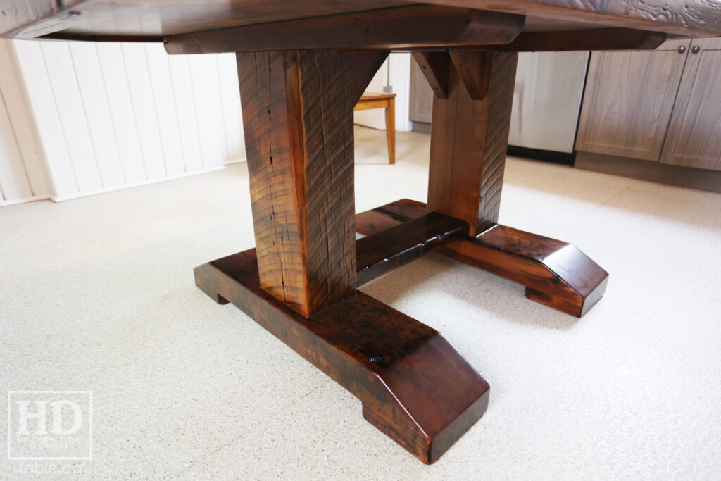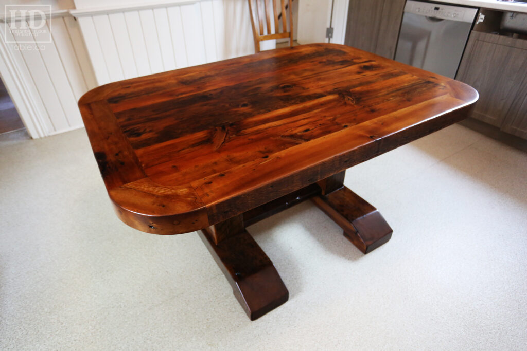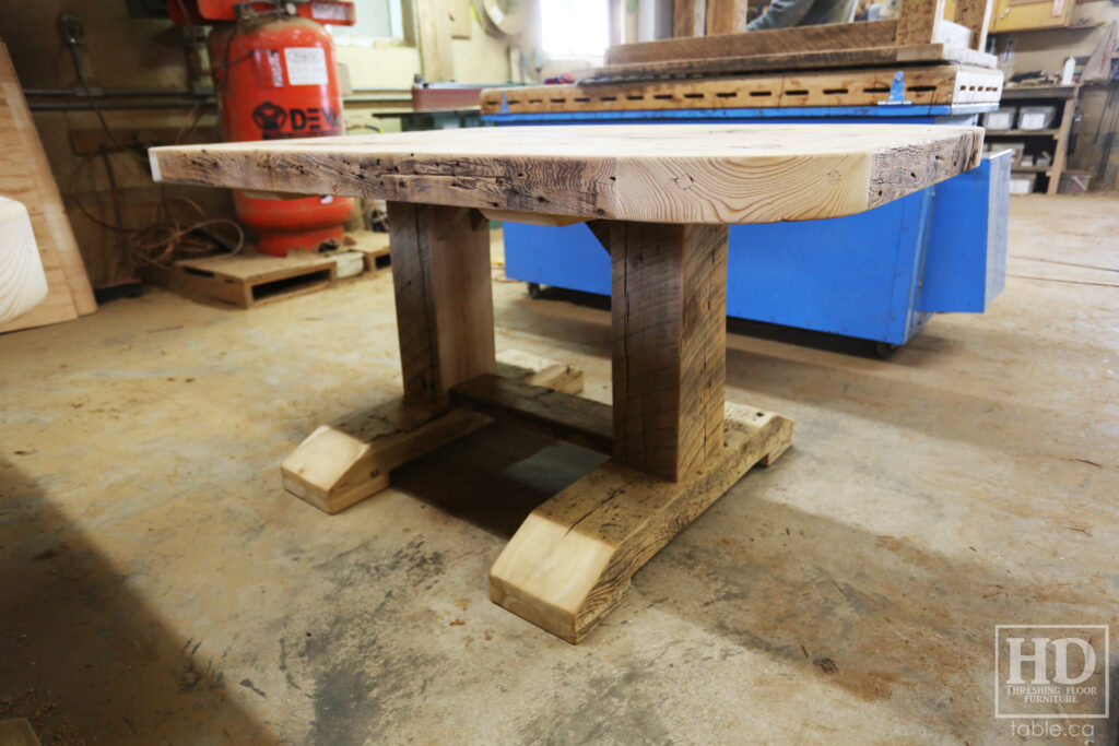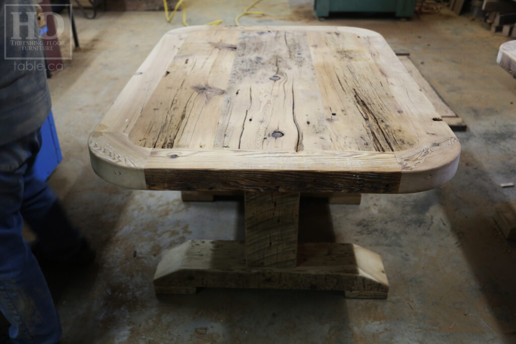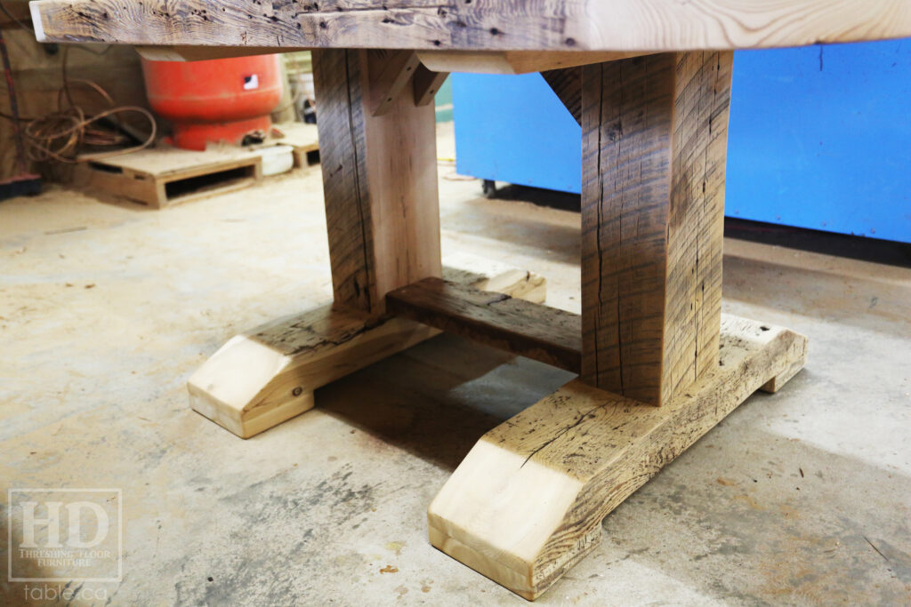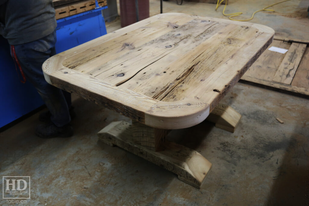 Project summary: 60″ Ontario Barnwood Table we made for a Port Hope office – 42″ wide – Extra thick 3″ top option – Hand-hewn Pedestals Base with rail – Old Growth Reclaimed Hemlock Construction – Original edges + patina kept – Rounded Corners Option – Epoxy seal on base option – Premium epoxy + satin polyurethane finish – www.table.ca