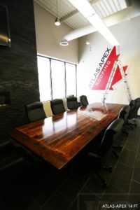 Description: 14 ft Boardroom Conference Table – 60″ wide – Reclaimed Solid Wood Hemlock Threshing Floor Construction – Premium epoxy/satin polyurethane finish – Custom cut steel logo routered into table top – Original Barnwood Distressing & Edges MaintainedÂÂ