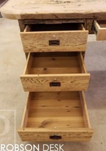 Details: Custom Reclaimed Wood Desk – 6 Drawers – Corner Keyboard Tray – Reclaimed Hemlock Threshing Floor Barnwood Construction – Lee Valley Antique Copper Hardware – Lockable Drawers – Premium epoxy/polyurethane topcoat finishÂÂ