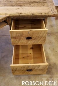 Details: Custom Reclaimed Wood Desk – 6 Drawers – Corner Keyboard Tray – Reclaimed Hemlock Threshing Floor Barnwood Construction – Lee Valley Antique Copper Hardware – Lockable Drawers – Premium epoxy/polyurethane topcoat finishÂÂ