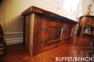 Details: 4 ft Reclaimed Wood Storage Bench – 17″ deep – 19″ height – 2 Doors – Adjustable 1″ Internal Shelf – 4″ x 4″ Reclaimed Windbrace Beam Posts on Corners – Premium epoxy/polyurethane finish – Lee Valley Hardware – Original distressed maintained – Old barn floor edges kept