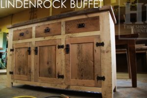 Details: 5 ft Buffet – 20″ deep – 36″ height – 3 drawers / 3 doors – Lee Valley Hardware – Reclaimed Hemlock Construction – Premium epoxy/polyurethane finish – Original barnwood edges maintained