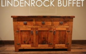 Details: 5 ft Buffet – 20″ deep – 36″ height – 3 drawers / 3 doors – Lee Valley Hardware – Reclaimed Hemlock Construction – Premium epoxy/polyurethane finish – Original barnwood edges maintained