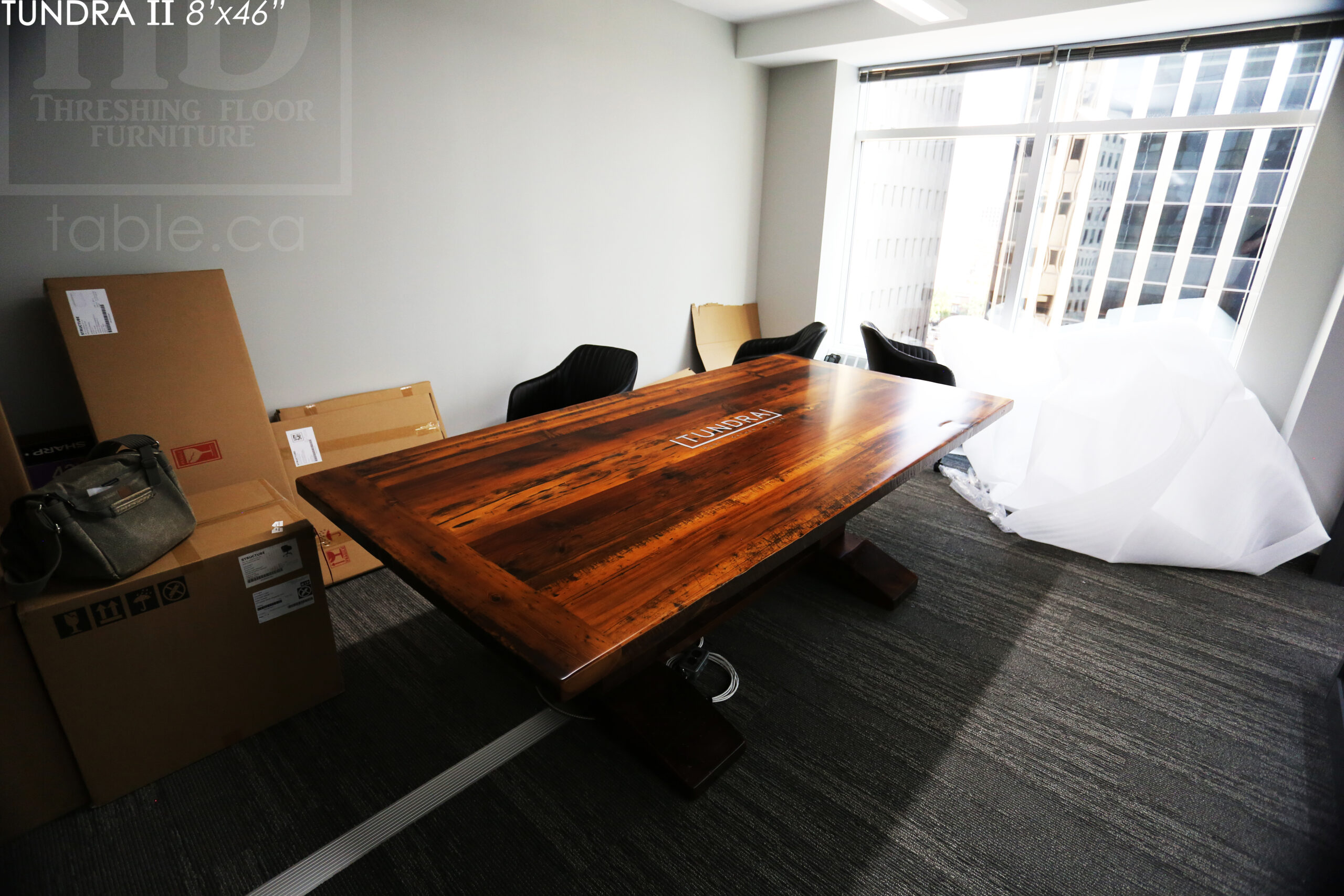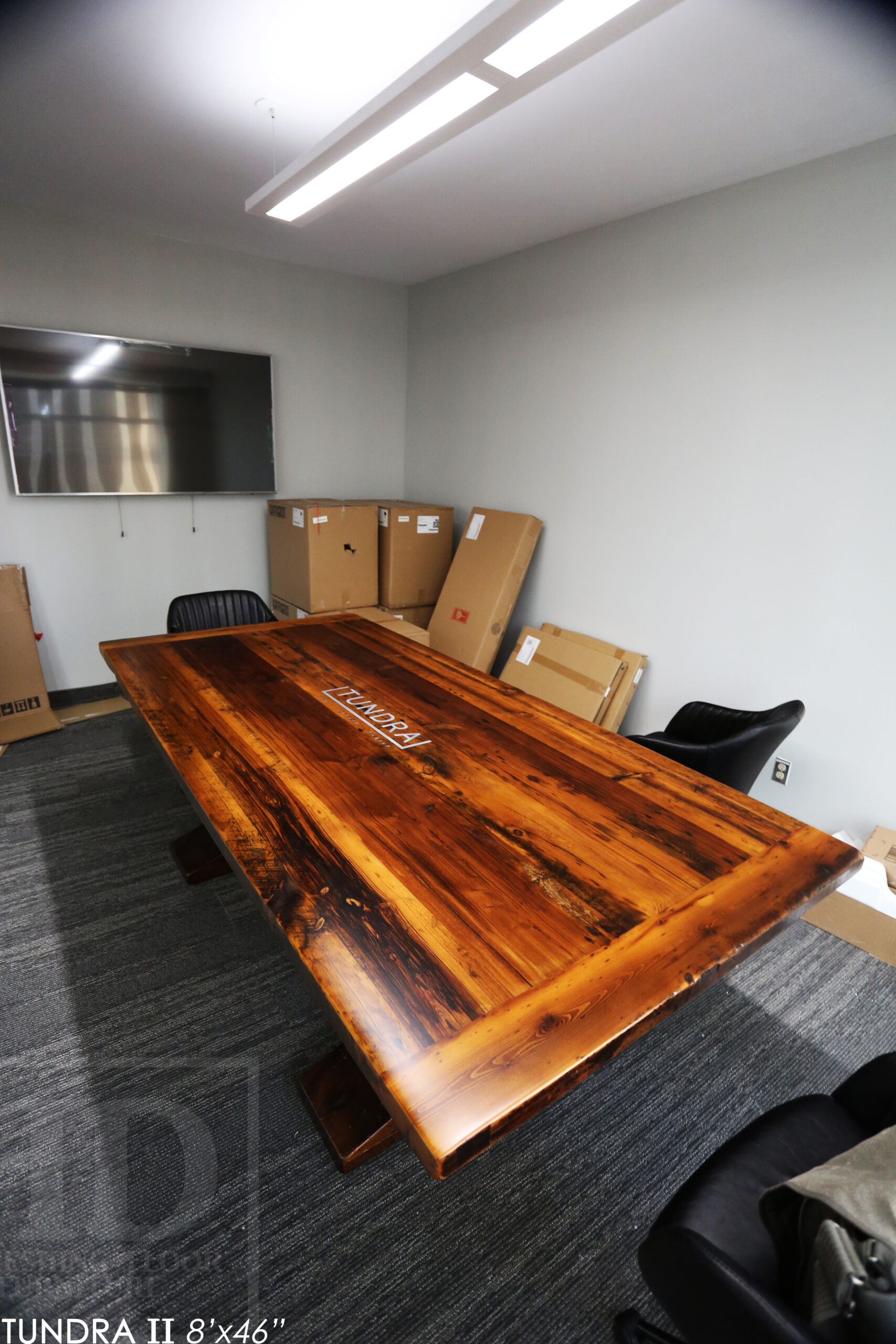 Our custom boardroom tables are made from old Ontario barnwood. For this project we made boardroom tables for a company’s various locations throughout Ontario. Here’s one: