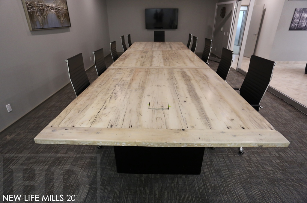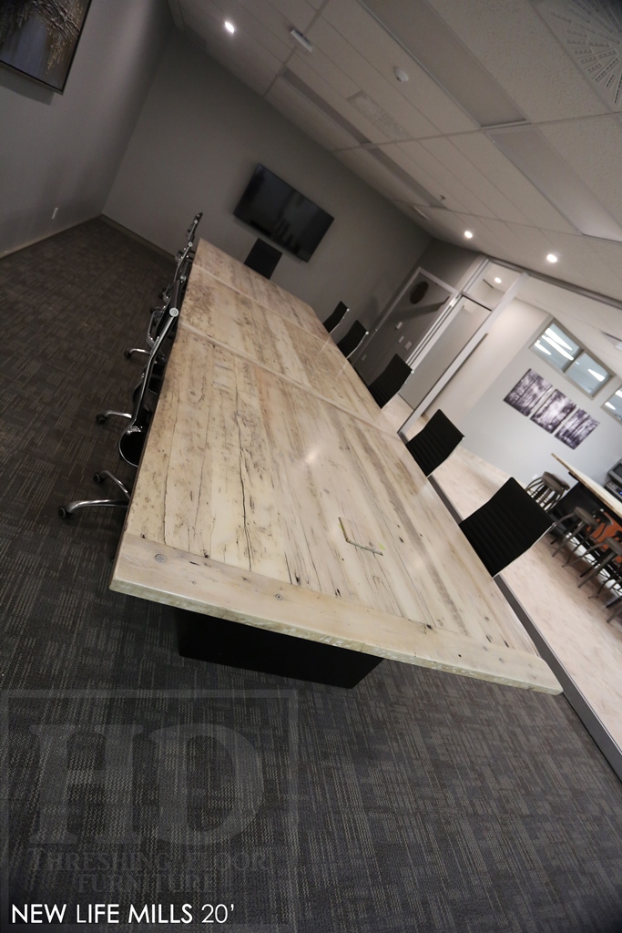 Description: 20 foot New Life Mills Boardroom Table – 72″ wide – 3″ Plank Post Base – Reclaimed Hemlock Threshing Floor Construction – Premium epoxy/polyurethane finish – Original Barnwood Edges Kept – Bleached Greytone Treatment