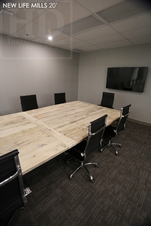 Description: 20 foot New Life Mills Boardroom Table – 72″ wide – 3″ Plank Post Base – Reclaimed Hemlock Threshing Floor Construction – Premium epoxy/polyurethane finish – Original Barnwood Edges Kept – Bleached Greytone TreatmentÂ