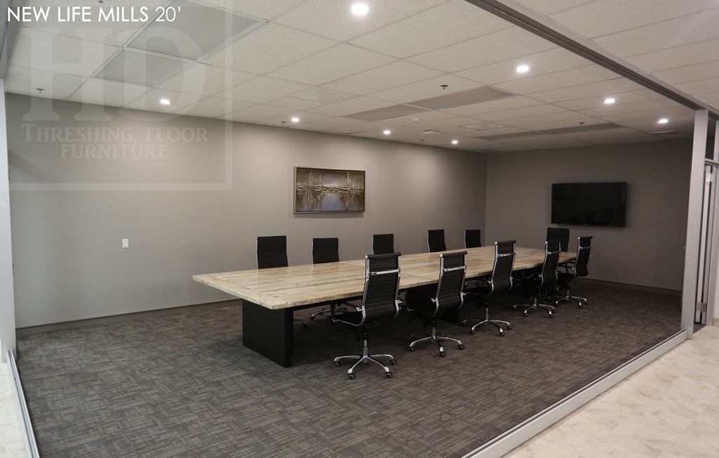 Description: 20 foot New Life Mills Boardroom Table – 72″ wide – 3″ Plank Post Base – Reclaimed Hemlock Threshing Floor Construction – Premium epoxy/polyurethane finish – Original Barnwood Edges Kept – Bleached Greytone Treatment
