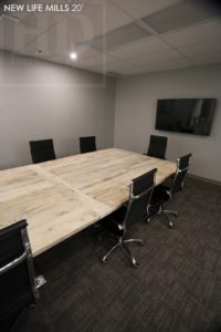 Description: 20 foot New Life Mills Boardroom Table – 72″ wide – 3″ Plank Post Base – Reclaimed Hemlock Threshing Floor Construction – Premium epoxy/polyurethane finish – Original Barnwood Edges Kept – Bleached Greytone TreatmentÂÂ