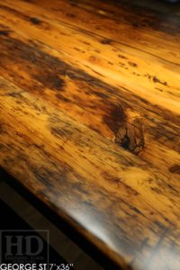Details: 7 ft Reclaimed Wood Table – 36″ wide – 39″ height – Reclaimed Hemlock Threshing Floor Construction – Premium epoxy with matte polyurethane topcoat finish – Matte Black Metal Base – Original distressing/barnwood edges kept