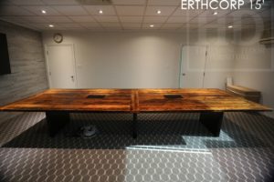 Description: 15 Foot Distressed Boardroom Table – 60 inches wide – Solid Reclaimed Hemlock Threshing Floor Construction – Waterproof Premium epoxy/satin polyurethane finish – Plank Style Base [Painted Black] / 3 posts – Centre On-site Final DowelingĂ‚Â