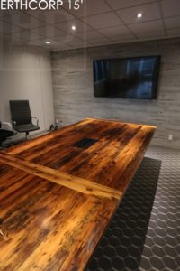 Description: 15 Foot Distressed Boardroom Table – 60 inches wide – Solid Reclaimed Hemlock Threshing Floor Construction – Waterproof Premium epoxy/satin polyurethane finish – Plank Style Base [Painted Black] / 3 posts – Centre On-site Final DowelingĂ‚Â
