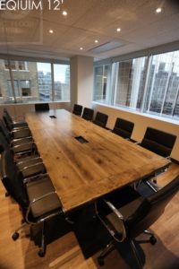 Details: 12 ft Boardroom Table – 50″ wide – Reclaimed Hemlock Threshing Floor Construction – Premium epoxy/polyurethane finish – Barnboard Greytone Treatment – Center on-site final doweling to accommodate service elevator – Original barnwood edges – Cut outs for electronics