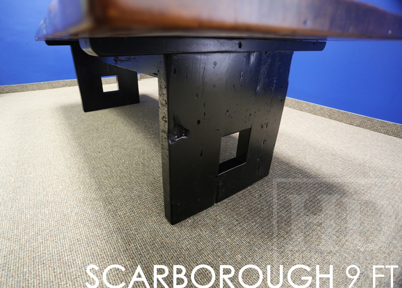 9 ft Reclaimed Wood Boardroom Table – 48″ wide – 3″ Plank Posts Base made from barn joists -Black Base – Premium epoxy/matte polyurethane finish – 2″ hole in centre of table – Reclaimed Threshing Floor Hemlock 2″ Top