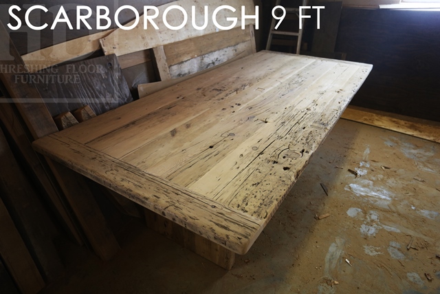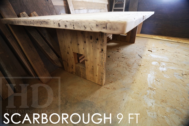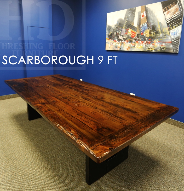 Details: 9 ft Reclaimed Wood Boardroom Table – 48″ wide – 3″ Plank Posts Base made from barn joists -Black Base – Premium epoxy/matte polyurethane finish – 2″ hole in centre of table – Reclaimed Threshing Floor Hemlock 2″ Top