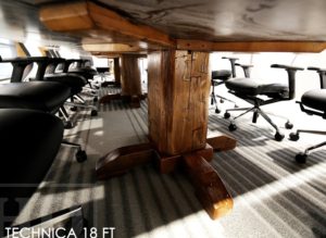Specifications: 18 foot Boardroom Table – Made in three 6′ x 6′ parts [for ease of delivery into building] – Reclaimed Hand-Hewn Beam Pedestals – Reclaimed Hemlock Threshing Floor 2″ Top – Premium epoxy / satin polyurethane topcoat – On site final dry doweling – Custom steel logo embedded into table centre – Original barn floor board live edges maintained
