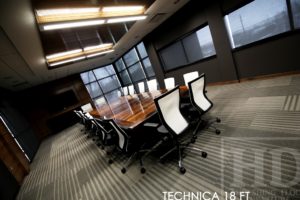 Specifications: 18 foot Boardroom Table – Made in three 6′ x 6′ parts [for ease of delivery into building] – Reclaimed Hand-Hewn Beam Pedestals – Reclaimed Hemlock Threshing Floor 2″ Top – Premium epoxy / satin polyurethane topcoat – On site final dry doweling – Custom steel logo embedded into table centre – Original barn floor board live edges maintained
