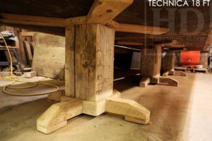 Specifications: 18 foot Boardroom Table – Made in three 6′ x 6′ parts [for ease of delivery into building] – Reclaimed Hand-Hewn Beam Pedestals – Reclaimed Hemlock Threshing Floor 2″ Top – Premium epoxy / satin polyurethane topcoat – On site final dry doweling – Custom steel logo embedded into table centre – Original barn floor board live edges maintained