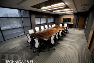 Specifications: 18 foot Boardroom Table – Made in three 6′ x 6′ parts [for ease of delivery into building] – Reclaimed Hand-Hewn Beam Pedestals – Reclaimed Hemlock Threshing Floor 2″ Top – Premium epoxy / satin polyurethane topcoat – On site final dry doweling – Custom steel logo embedded into table centre – Original barn floor board live edges maintained