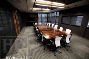 Specifications: 18 foot Boardroom Table – Made in three 6′ x 6′ parts [for ease of delivery into building] – Reclaimed Hand-Hewn Beam Pedestals – Reclaimed Hemlock Threshing Floor 2″ Top – Premium epoxy / satin polyurethane topcoat – On site final dry doweling – Custom steel logo embedded into table centre – Original barn floor board live edges maintained
