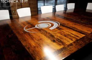 Specifications: 18 foot Boardroom Table – Made in three 6′ x 6′ parts [for ease of delivery into building] – Reclaimed Hand-Hewn Beam Pedestals – Reclaimed Hemlock Threshing Floor 2″ Top – Premium epoxy / satin polyurethane topcoat – On site final dry doweling – Custom steel logo embedded into table centre – Original barn floor board live edges maintained