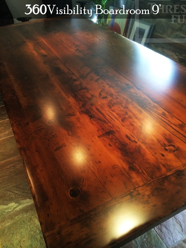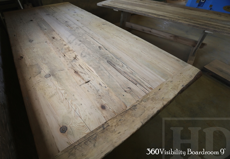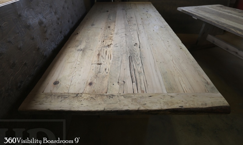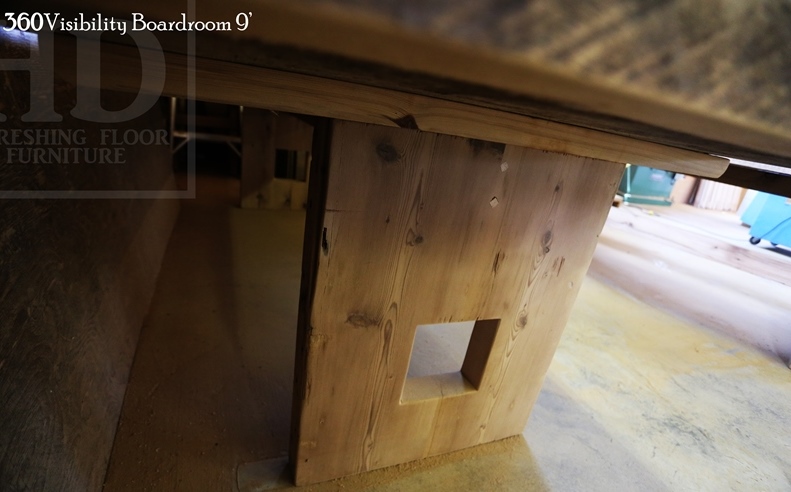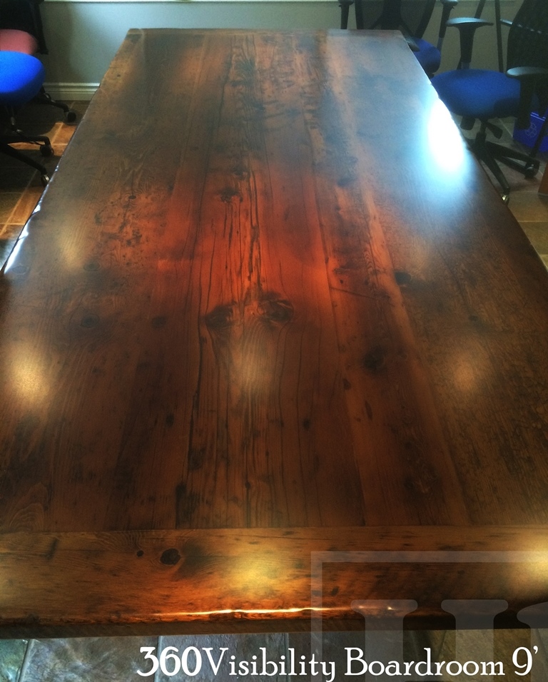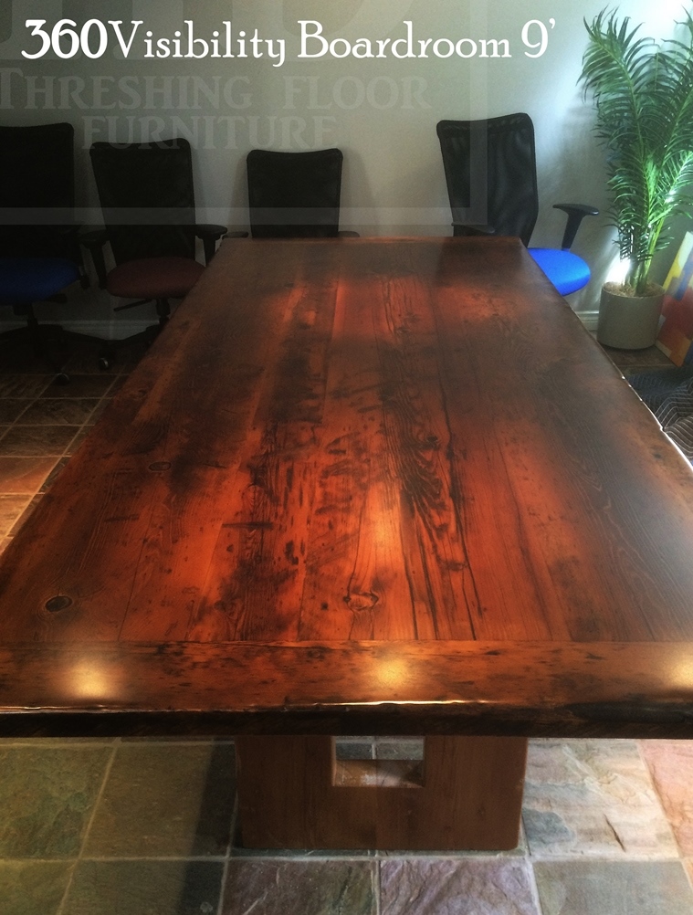 Specifications: 9 ft Boardroom Table -48″ wide – Premium epoxy/polyurethane finish – 3″ joist plank style modern base – Cavity in posts – Reclaimed Hemlock Threshing Floor Construction – Original live barnwood edges maintained