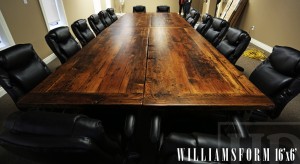 Specifications: 16 ft Boardroom Table – 3″ Plank Post Style Base – Made up of 8′ x 36″ Sections that can be re-configured – Reclaimed Hemlock Threshing Floor 2″ top – Premium epoxy/matte polyurethane finish Gerald Reinink