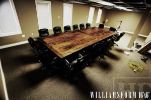 Specifications: 16 ft Boardroom Table – 3″ Plank Post Style Base – Made up of 8′ x 36″ Sections that can be re-configured – Reclaimed Hemlock Threshing Floor 2″ top – Premium epoxy/matte polyurethane finish Gerald Reinink