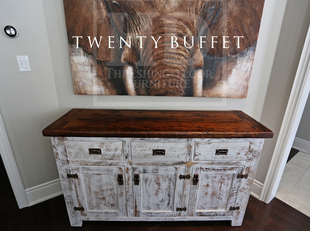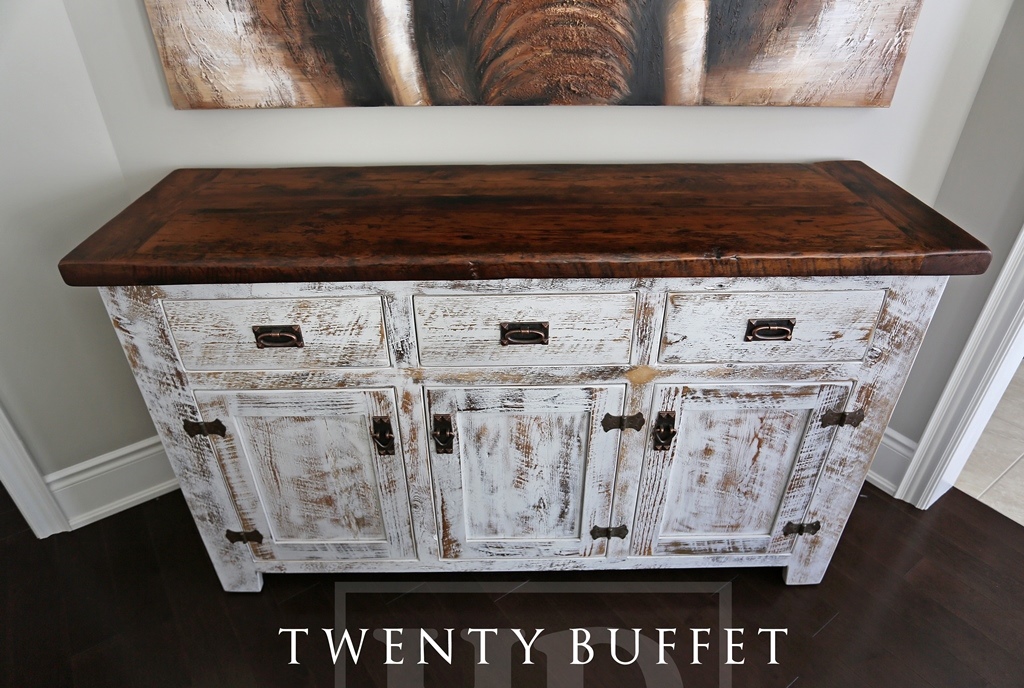 Specs: 5 foot Buffet -Â 18 inches deep – 3 doors – 3 drawers – 36″ Counter Height – Antique Copper Lee Valley Hardware – Distressed Whitewash Finish on Base – Premium epoxy/matte polyurethane topcoat finish
