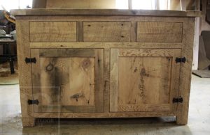 Specifications: 5 foot Buffet – 18″ deep – 36″ height – 3 drawers – 2 doors – Lee Valley Antique Copper Hardware – Reclaimed 1″ Hemlock – 2″ Threshing Floor Top – Original barn board edges – Posted by Gerald Reinink, Design & Sales