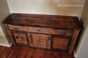 Specifications: 6 ft Buffet – 18″ deep – 36″ Height – Reclaimed Pine Threshing Floor / Grainery Board Construction – Lee Valley Hardware – 3 drawers / 3 doors – Original Distressing/Edges MaintainedÂÂ