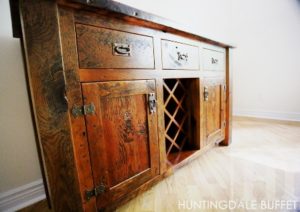 Description: 5 ft Reclaimed Wood Cabinet – 18″ deep – Premium epoxy / matte polyurethane finish – 3 drawers – Lee Valley Antique Copper Hardware – 2 shaker door – centre wine bottle rack – Reclaimed Pine Grainery Board Construction – Threshing Floor 2″ Top – Original barnwood edges
