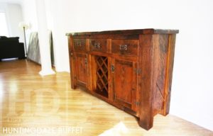 Description: 5 ft Reclaimed Wood Cabinet – 18″ deep – Premium epoxy / matte polyurethane finish – 3 drawers – Lee Valley Antique Copper Hardware – 2 shaker door – centre wine bottle rack – Reclaimed Pine Grainery Board Construction – Threshing Floor 2″ Top – Original barnwood edges