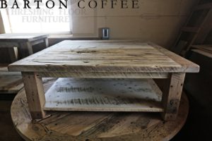 Description: 48″ x 48″ Coffee Table – 18″ height – Straight Windbrace Beam Legs – Bottom 1″ Shelf – Reclaimed Hemlock Threshing Floor Construction – Original Barn Floor Board Edges Maintained