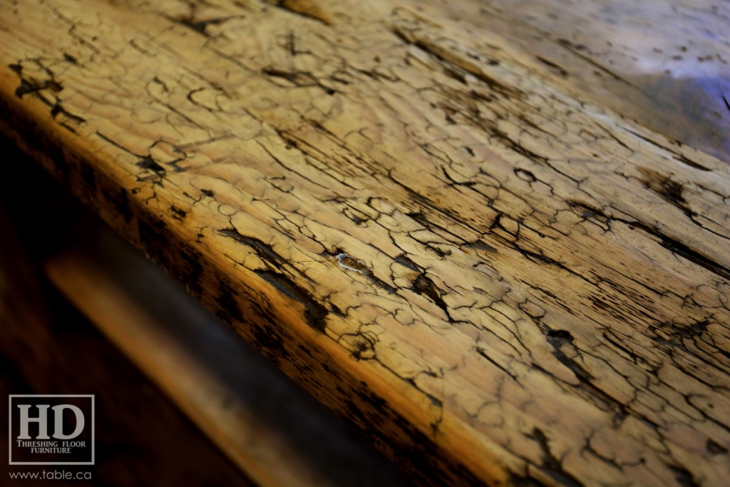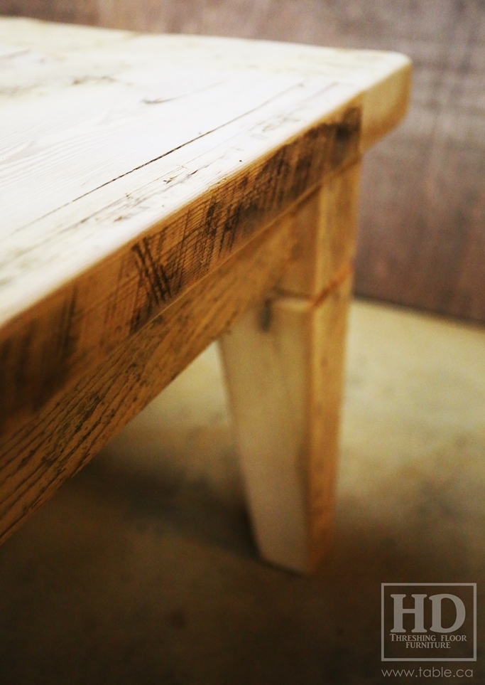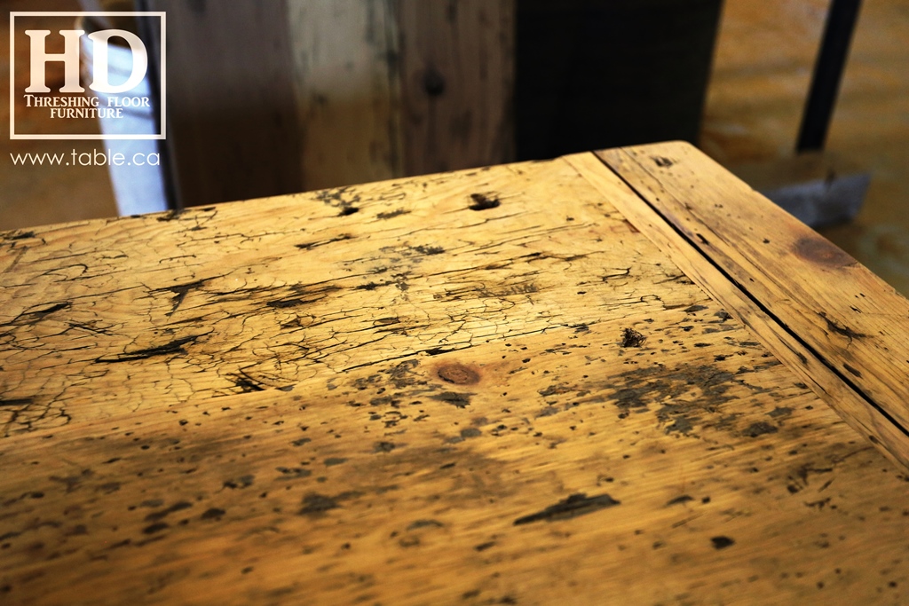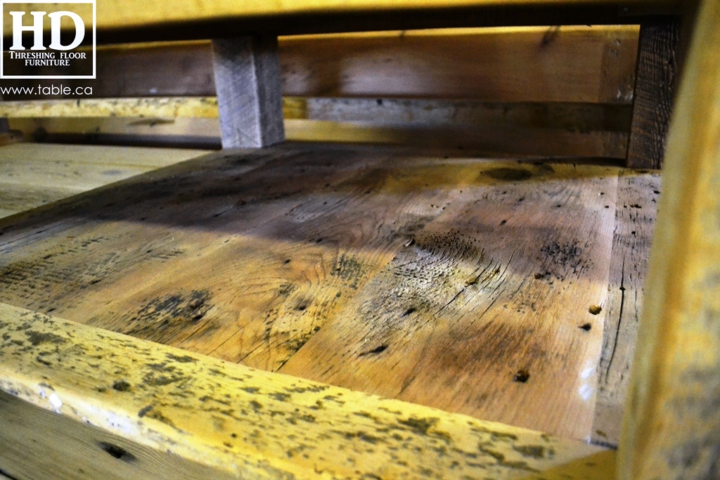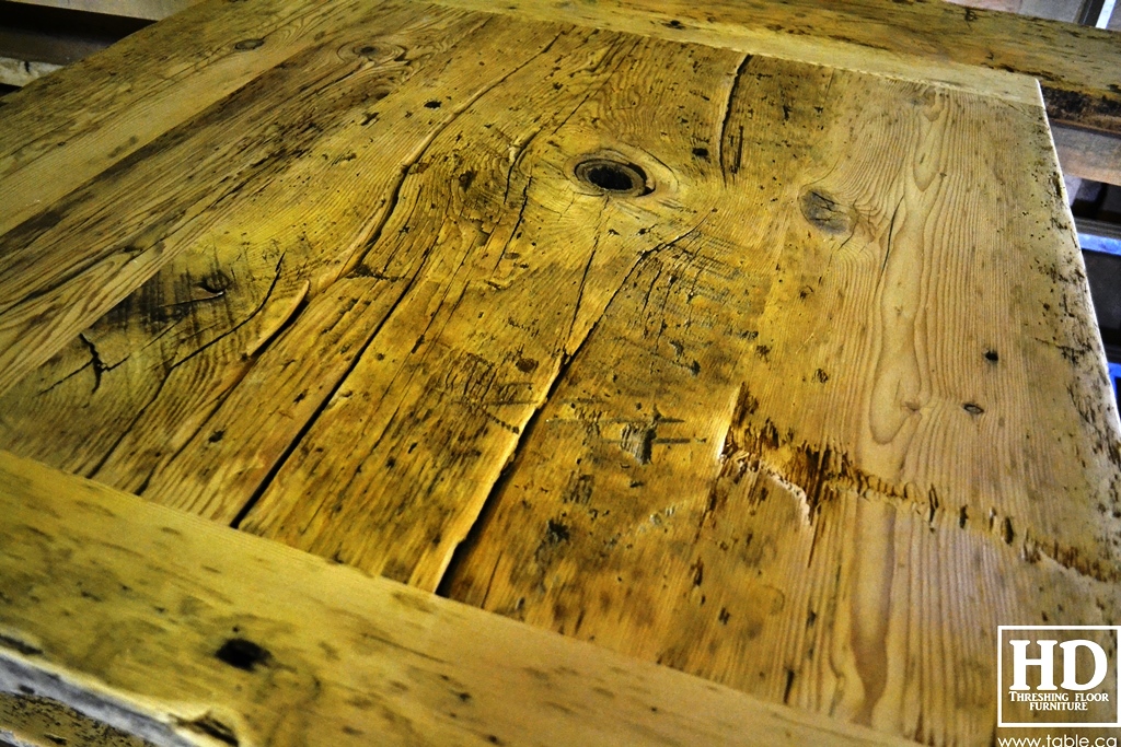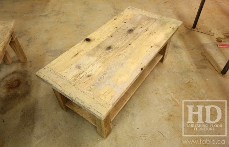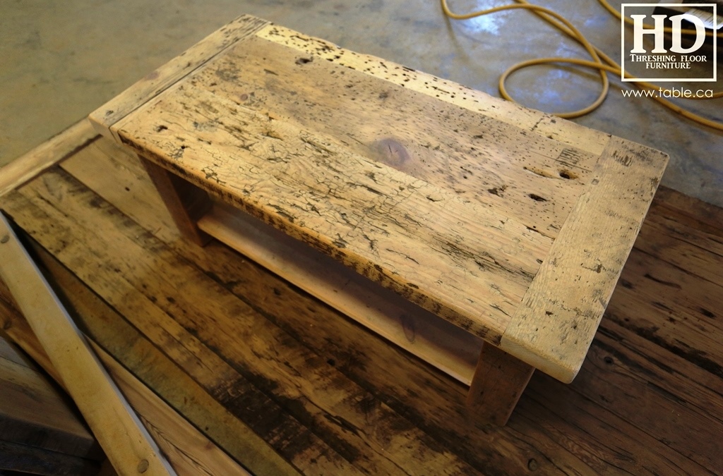 Details: Reclaimed Hemlock & Pine Threshing Floor Coffee Tables – Custom Hand-made Locally – Solid Wood – Original Barn Floor Board Edges Maintained – Rustic pioneer history marks kept