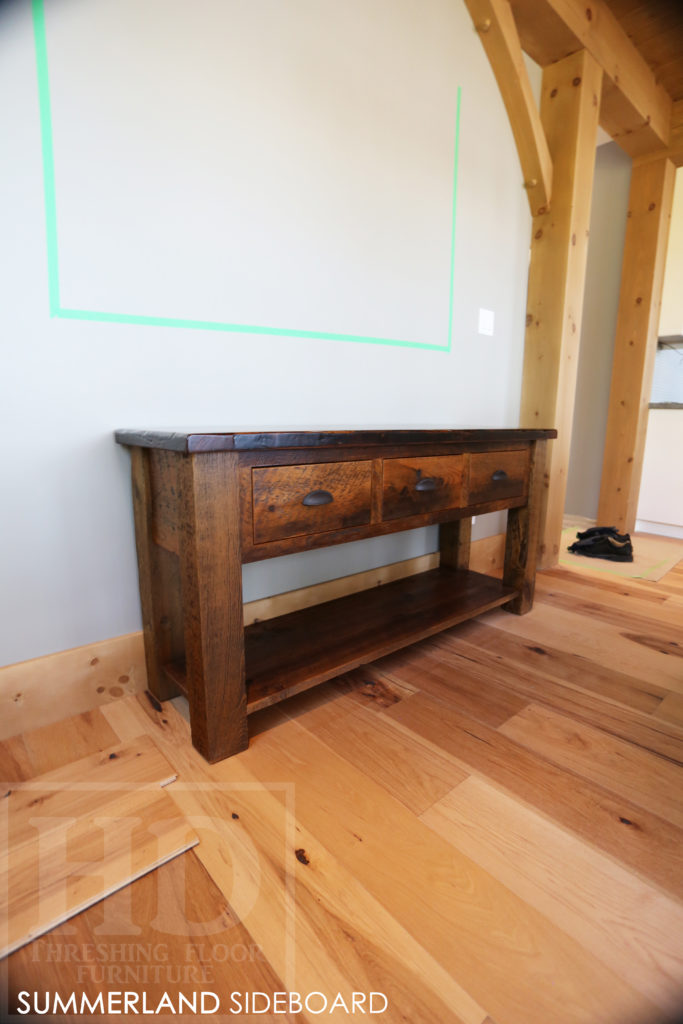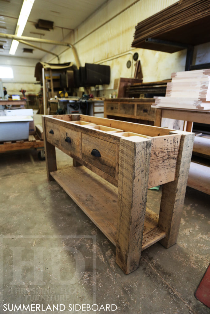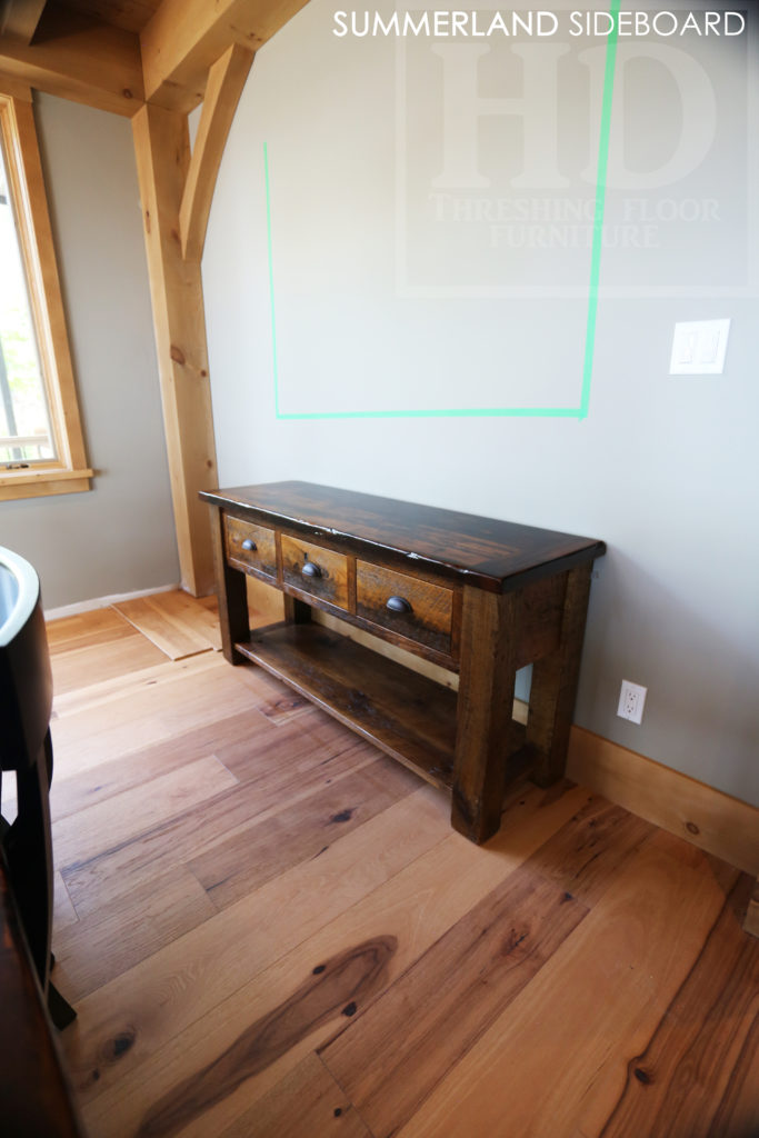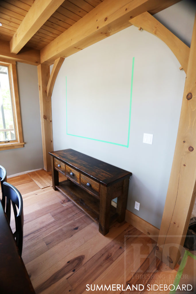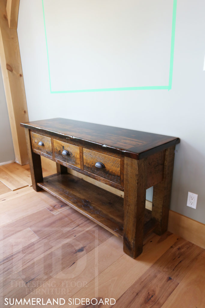 Our custom built reclaimed wood sideboards will compliment a dining space given our finish. The top can work as additional bar top space. Check out this one we made for a Washago cottage: