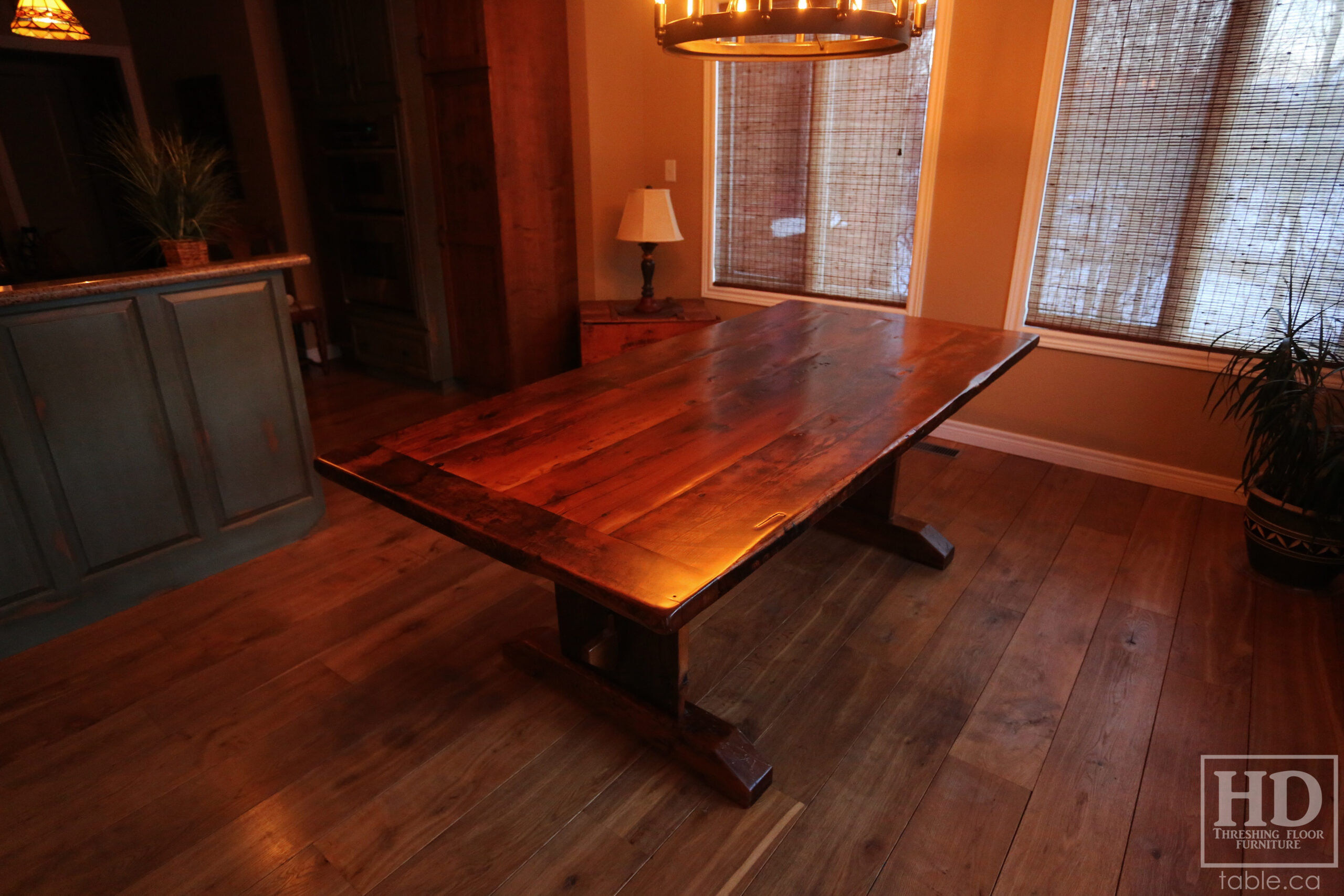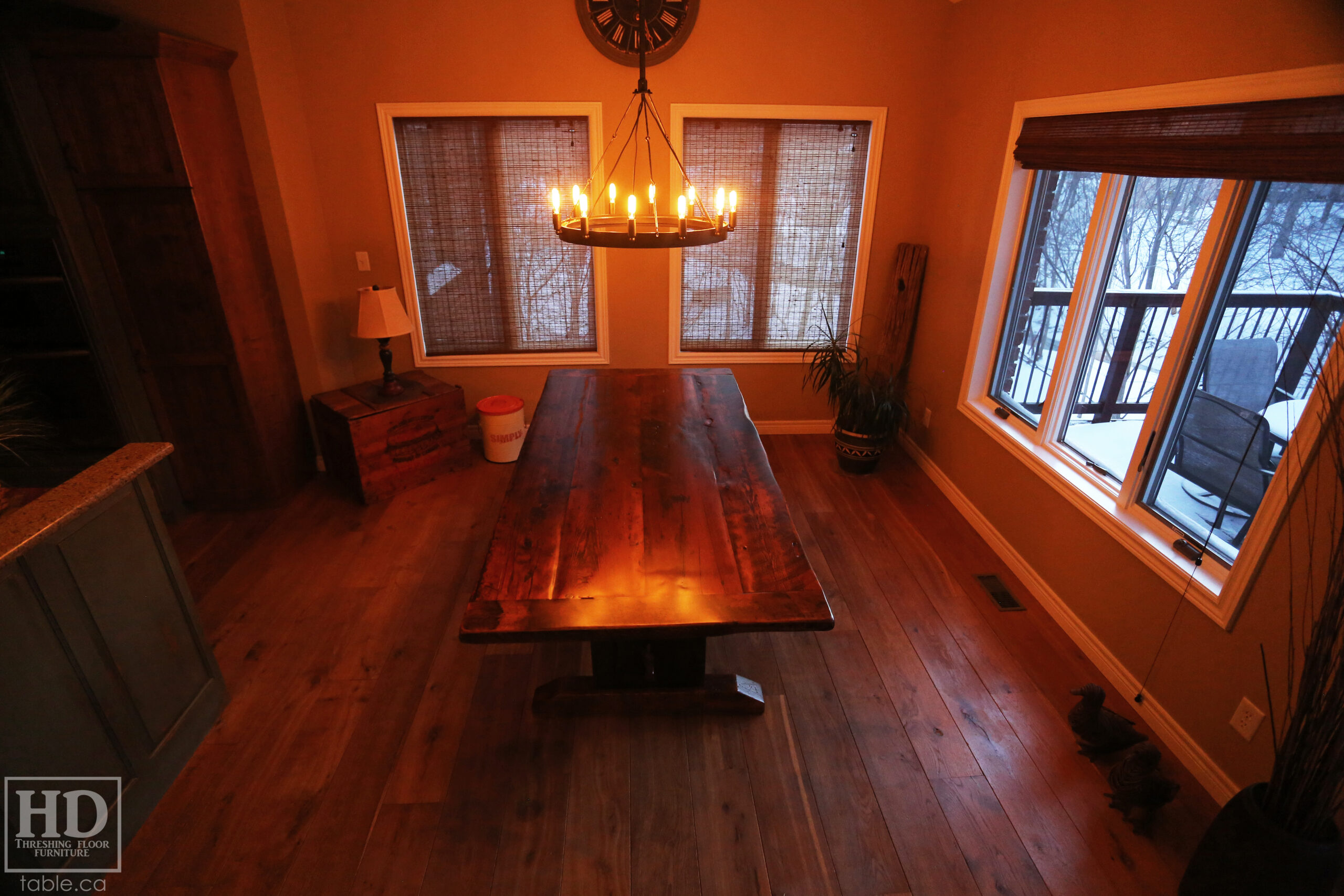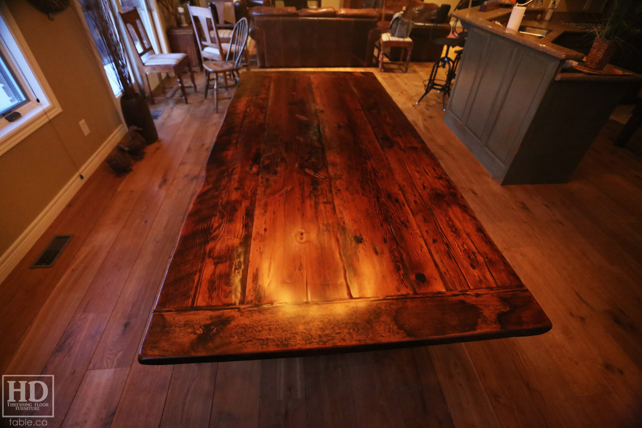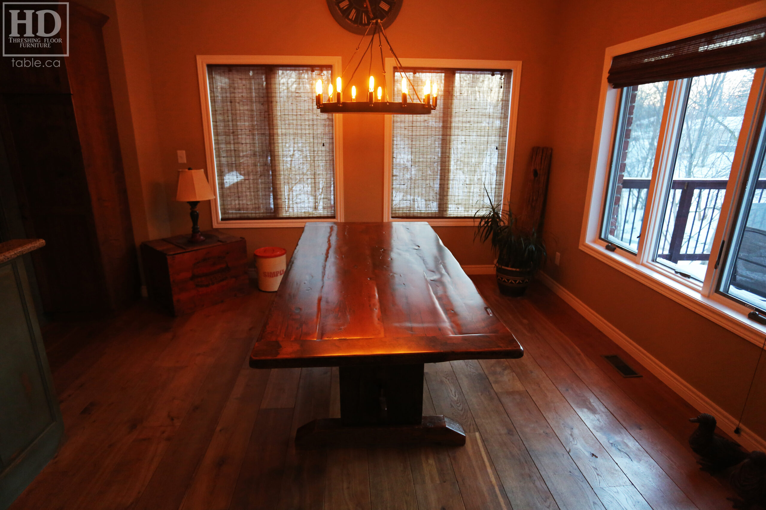 To feel more of the original distressing, consider our light epoxy coating option. In this case we don’t fill the cavities/distressing. Though a bit less practical; the character of the wood is really pronounced. The “bad” lighting in these photos we took of this reclaimed wood cottage table with trestle base show the rougher finish: