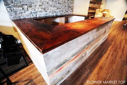 Details: Custom Reclaimed Wood Counter Top – 2″ thick Hemlock Threshing Floor – Original Barnwood Edges – Mitred Corners – Satin Polyurethane Finish
