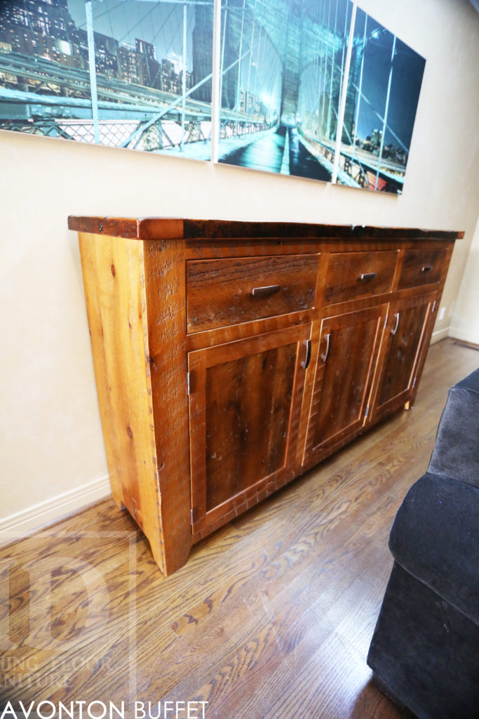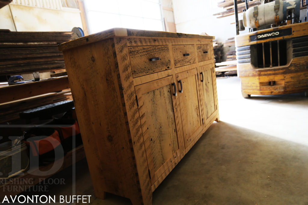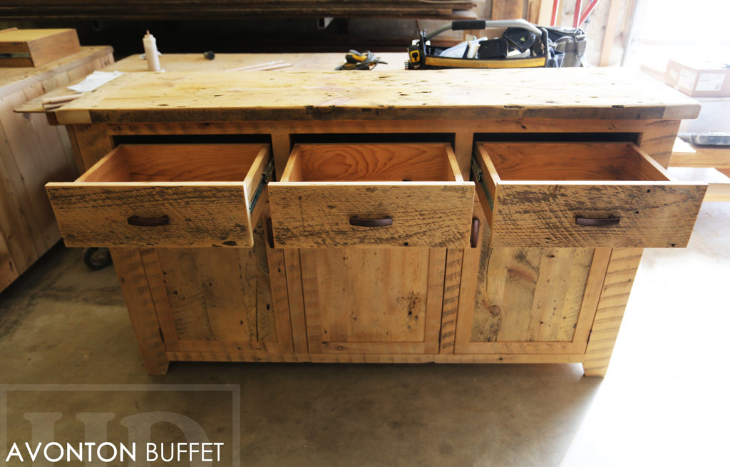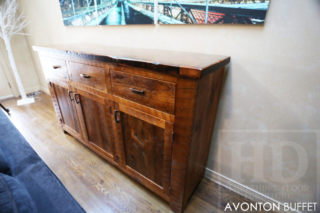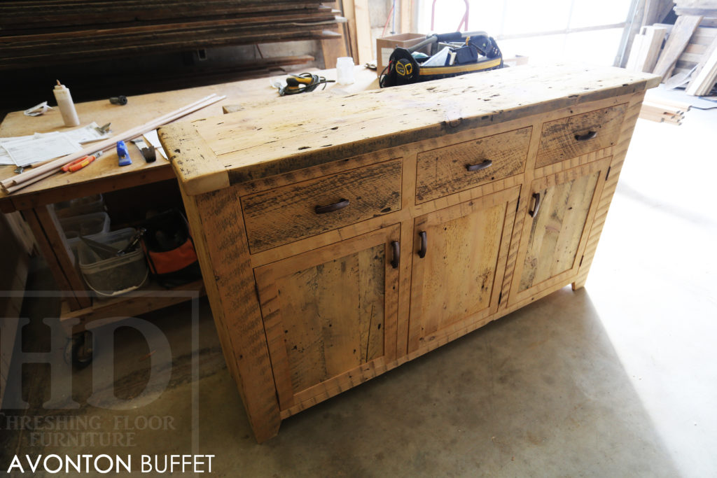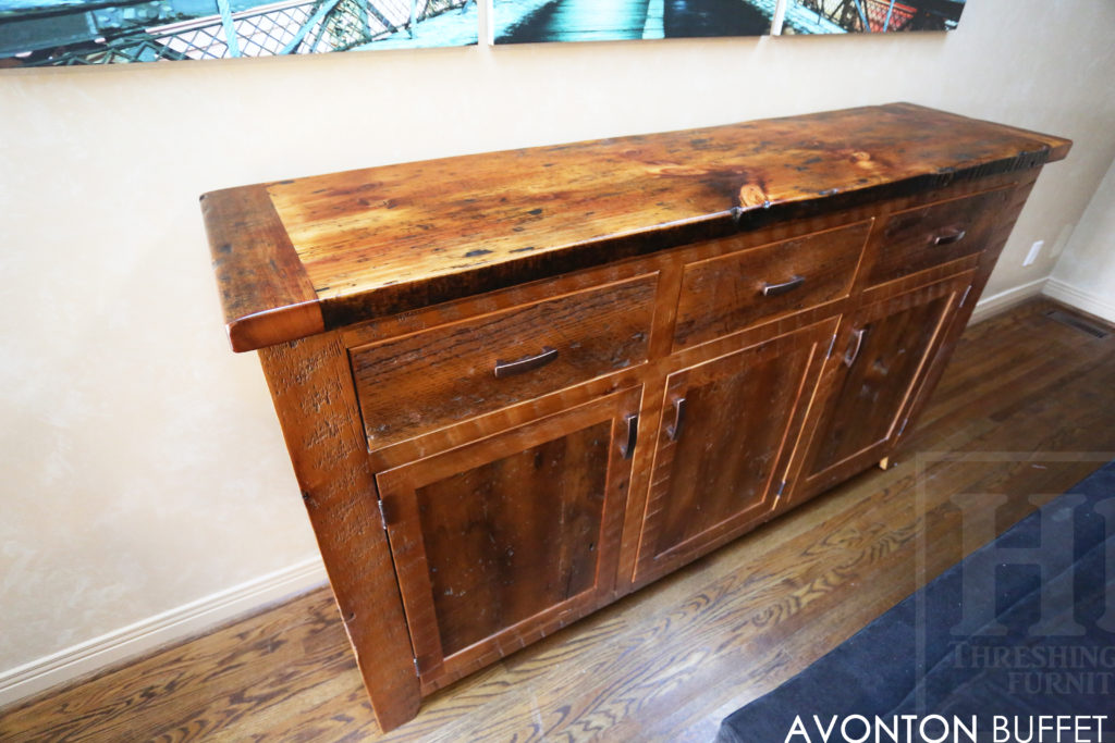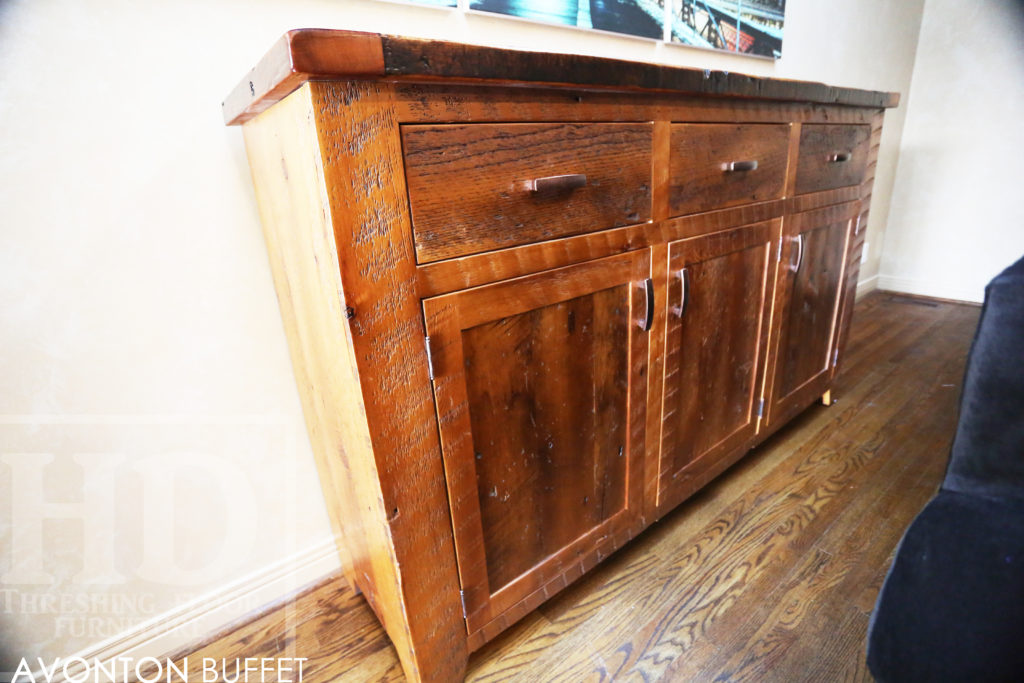 Specifications: 6 ft Reclaimed Wood Credenza Buffet – 42″ [Bar] Height – 18″ deep – 3 drawers – 3 doors – Lee Valley Hardware – Hemlock Threshing Floor / Grainery Board Construction – Premium epoxy/polyurethane finish – Original edges/distressing kept / www.hdthreshing.dreamhosters.com/blog