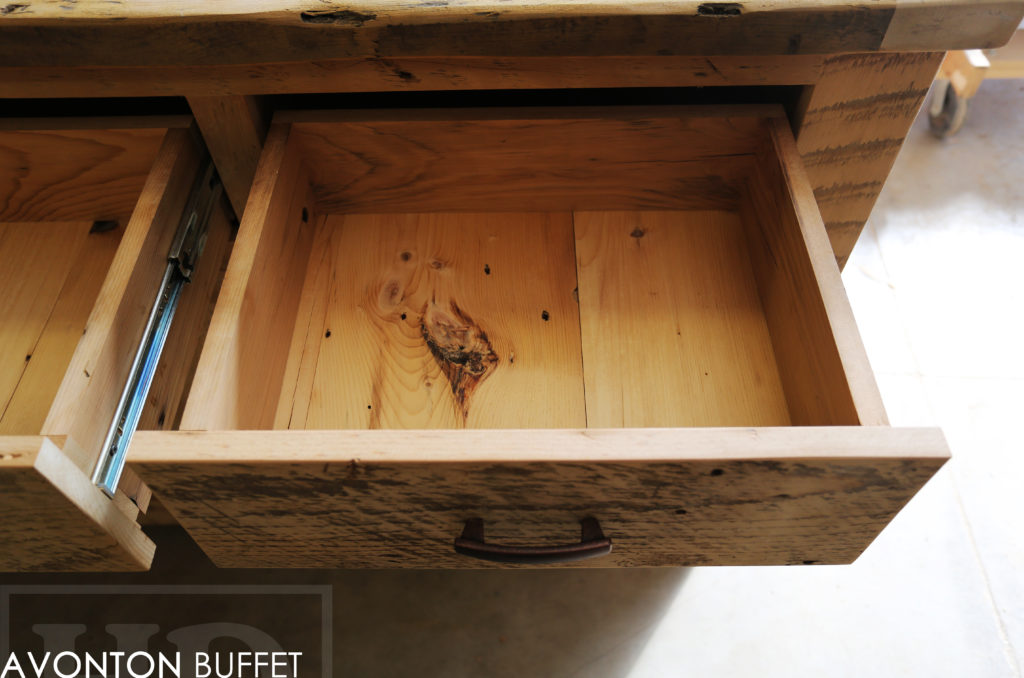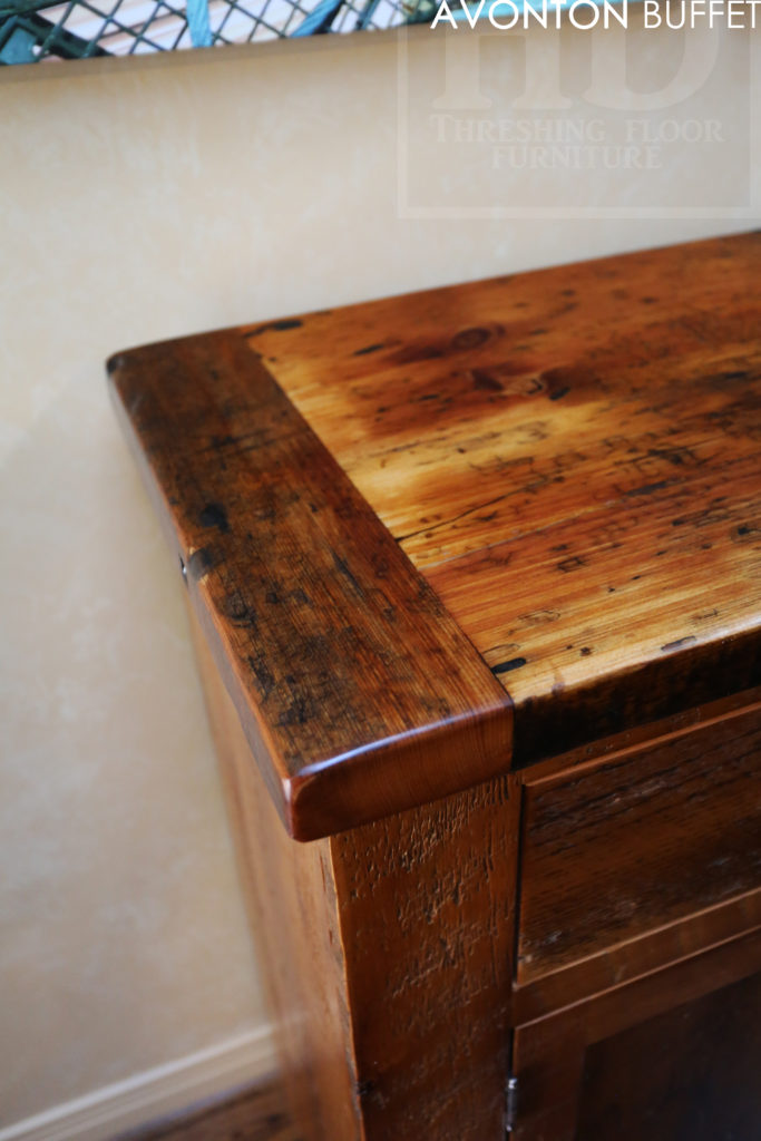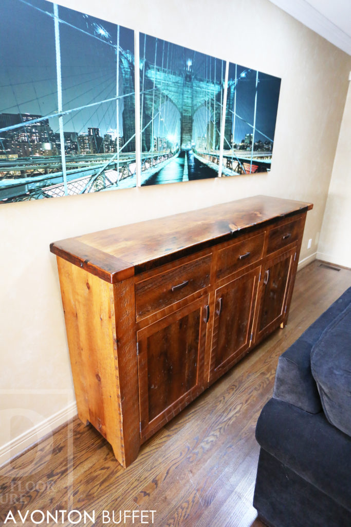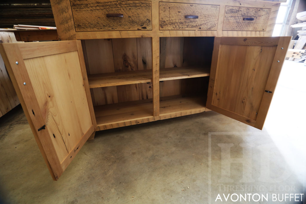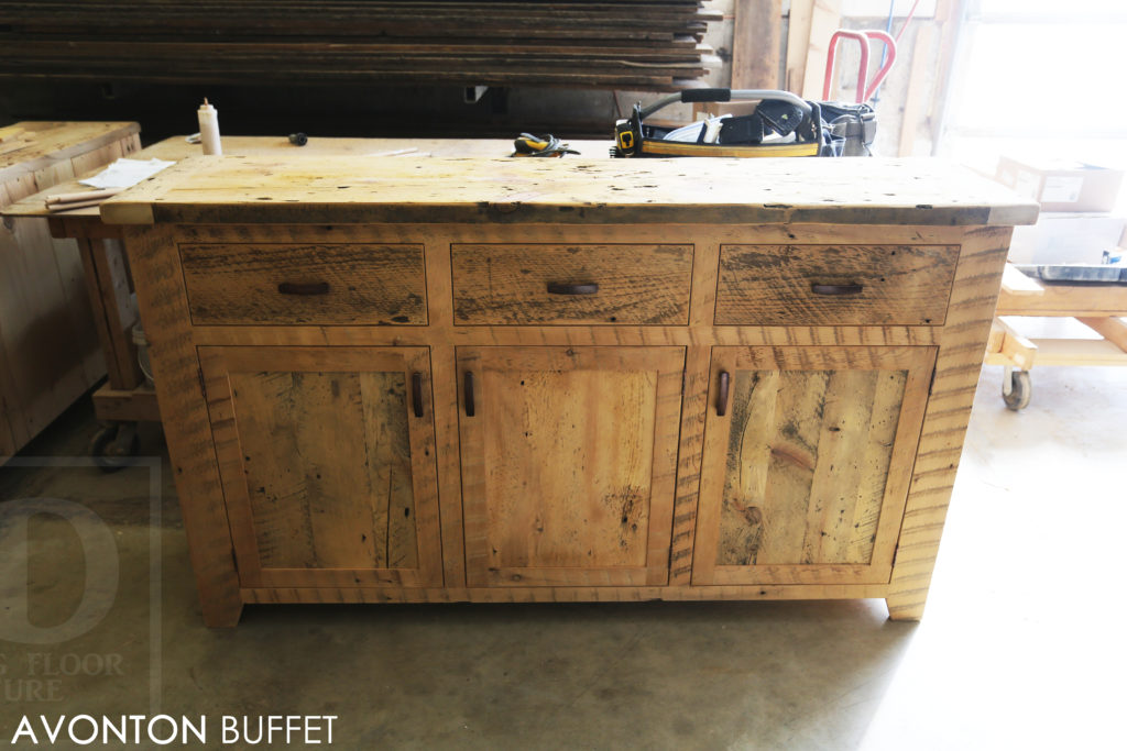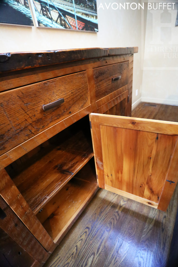 Specifications: 6 ft Reclaimed Wood Credenza Buffet – 42″ [Bar] Height – 18″ deep – 3 drawers – 3 doors – Lee Valley Hardware – Hemlock Threshing Floor / Grainery Board Construction – Premium epoxy/polyurethane finish – Original edges/distressing kept / www.hdthreshing.dreamhosters.com/blog