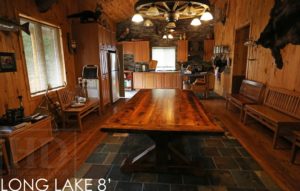 Specifications: 8 ft Sawbuck Table – 46″ wide – Beam style base – Reclaimed Hemlock Threshing Floor Construction – Premium epoxy/polyurethane finish – Original barnwood floor board edges maintainedÂÂ