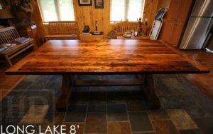 Specifications: 8 ft Sawbuck Table – 46″ wide – Beam style base – Reclaimed Hemlock Threshing Floor Construction – Premium epoxy/polyurethane finish – Original barnwood floor board edges maintainedÂÂ
