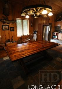 Specifications: 8 ft Sawbuck Table – 46″ wide – Beam style base – Reclaimed Hemlock Threshing Floor Construction – Premium epoxy/polyurethane finish – Original barnwood floor board edges maintainedÂÂ