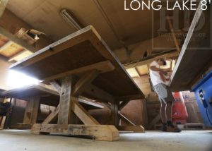 Specifications: 8 ft Sawbuck Table – 46″ wide – Beam style base – Reclaimed Hemlock Threshing Floor Construction – Premium epoxy/polyurethane finish – Original barnwood floor board edges maintainedÂÂ