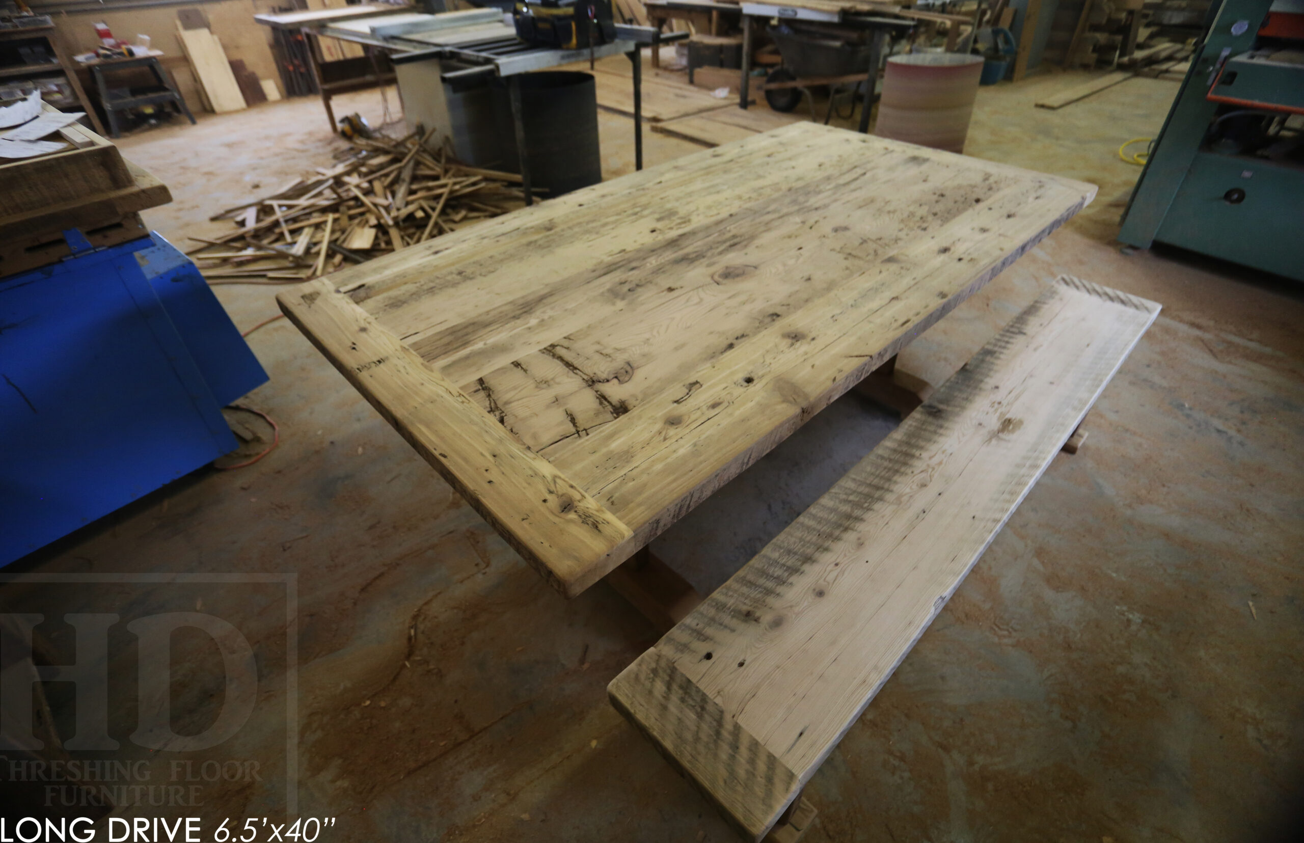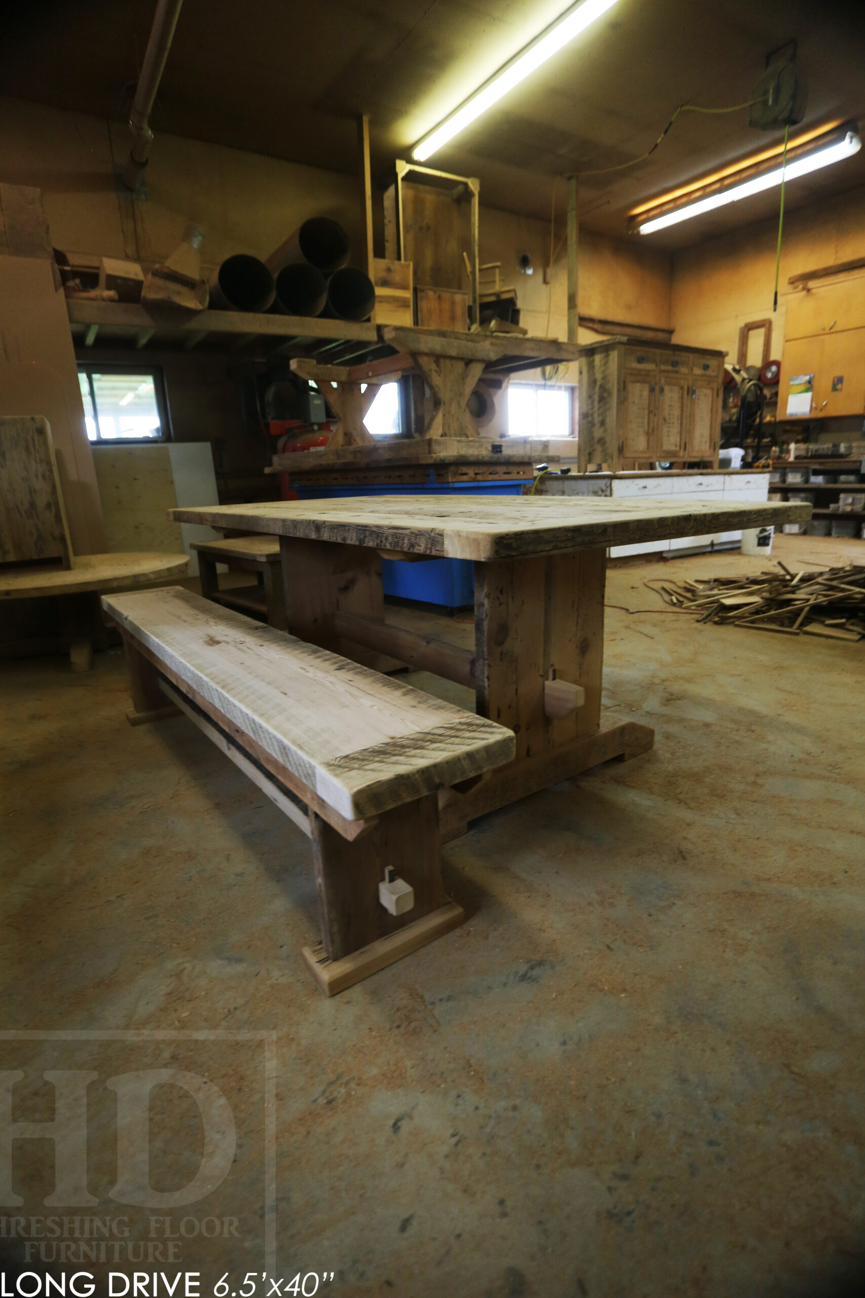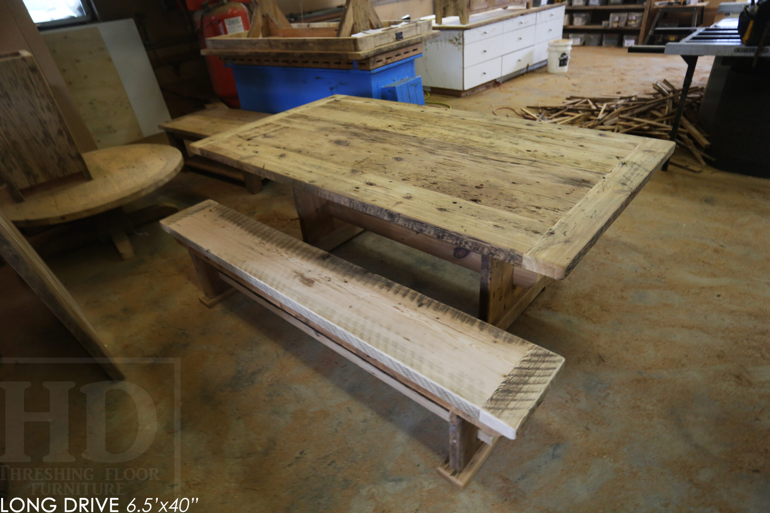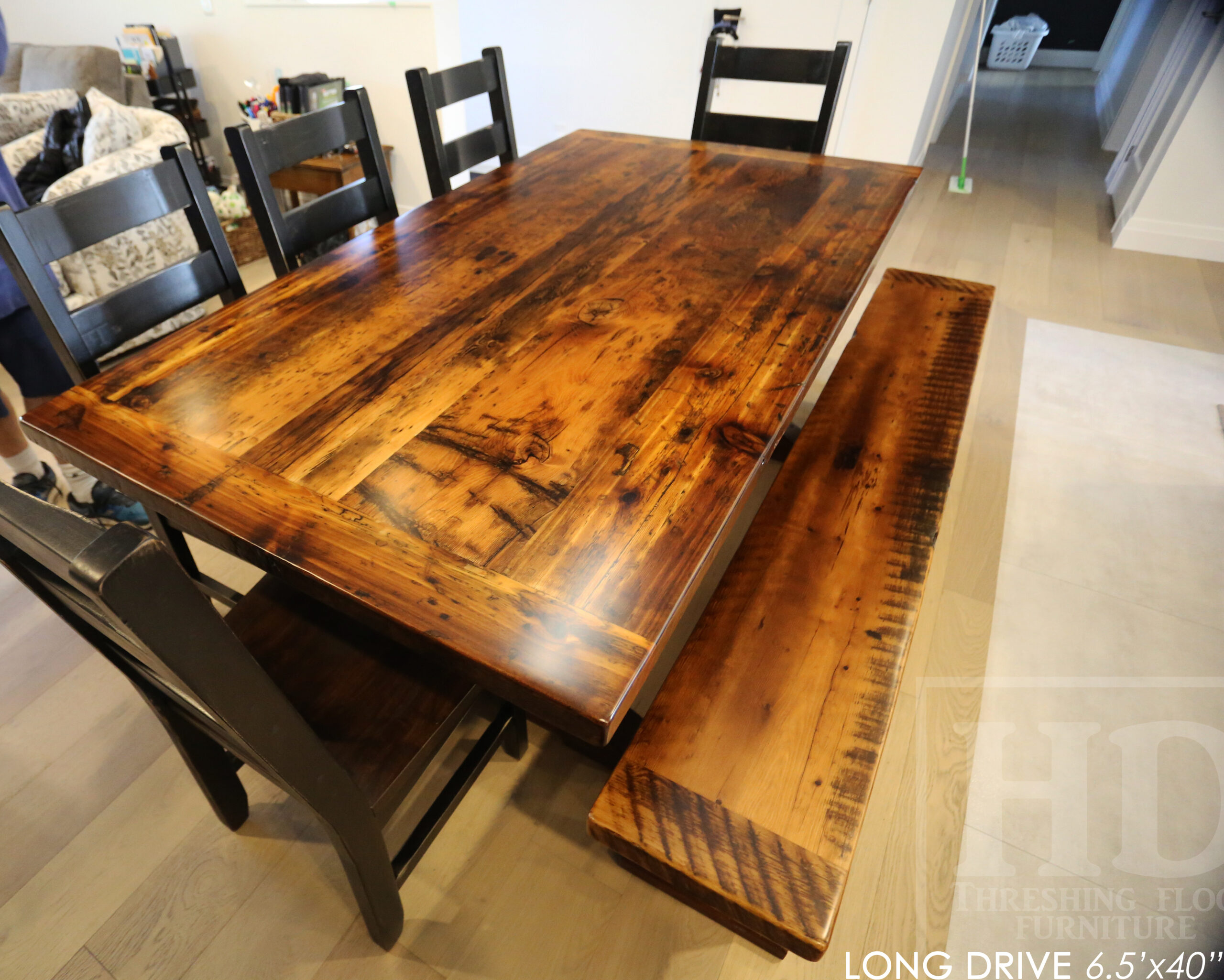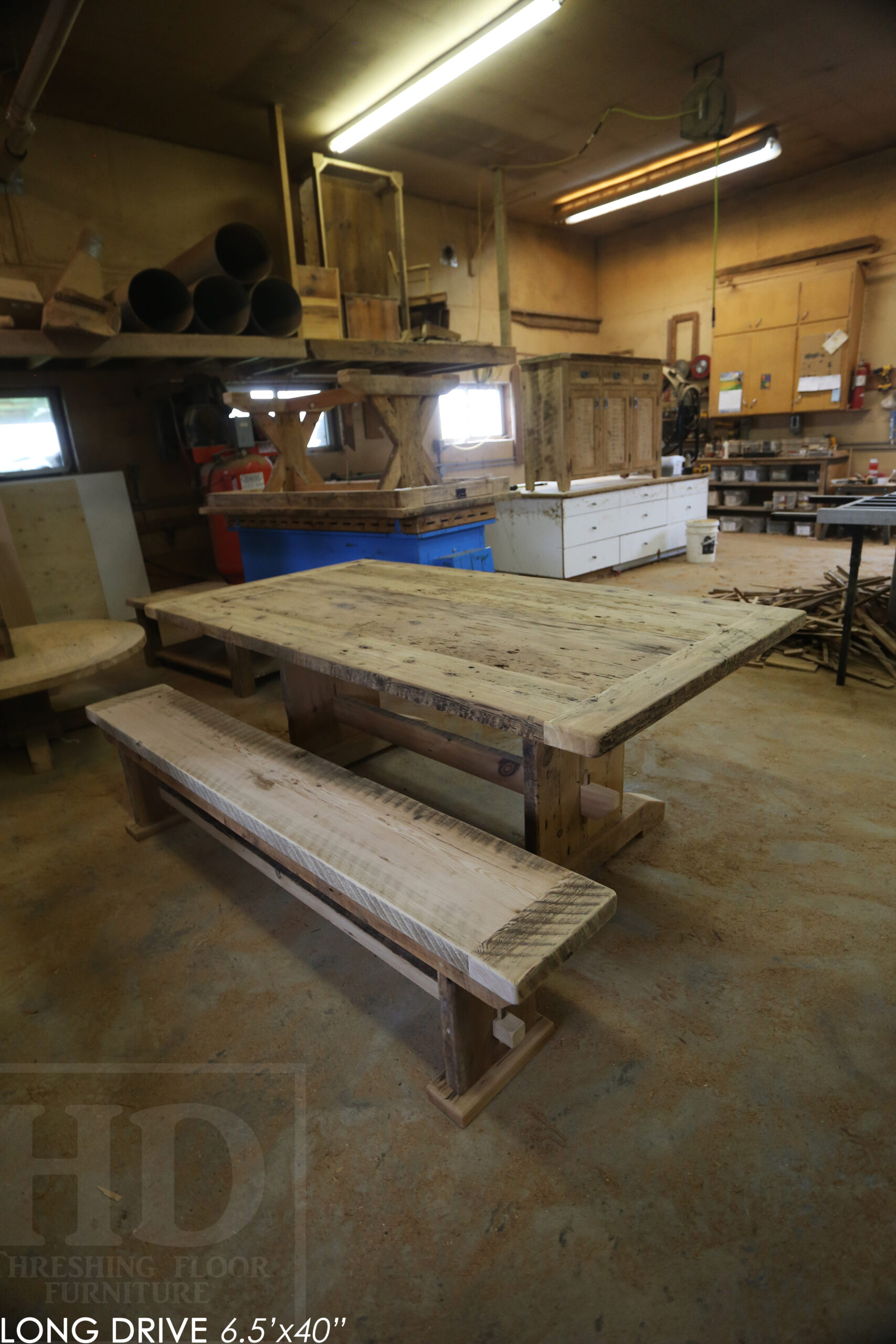 ![6.5' Reclaimed Wood Table for a Burlington home - 42" wide - Trestle Base - Hemlock Threshing Floor Construction / Medium Sanding out of Original Patina - Original edges & distressing maintained - Premium epoxy + satin polyurethane finish - 6.5' [matching] Reclaimed wood bench - 5 Non-arm Ladder Back Chairs - Wormy Maple - Black with sandthroughs frame / seat stained colour of table / www.table.ca](https://www.hdthreshing.dreamhosters.com/blog/blog/wp-content/uploads/2021/08/rustic-reclaimed-wood-table-burlington-ontario-gerald-reinink-29-scaled.jpg)
