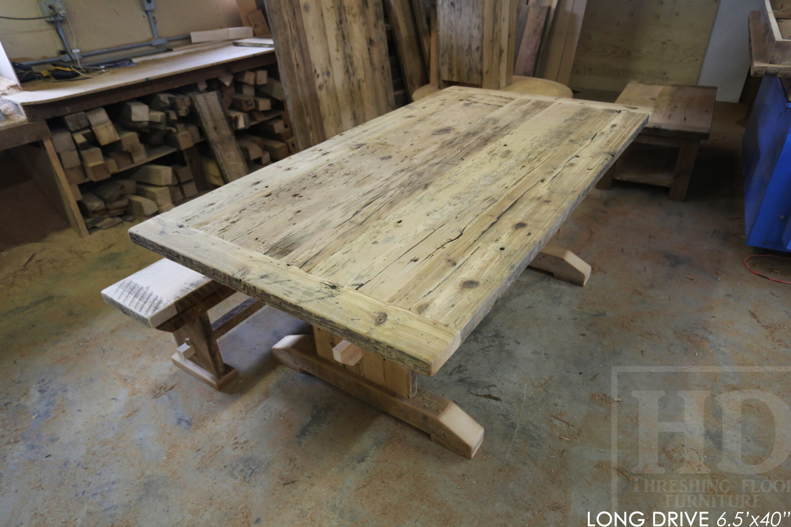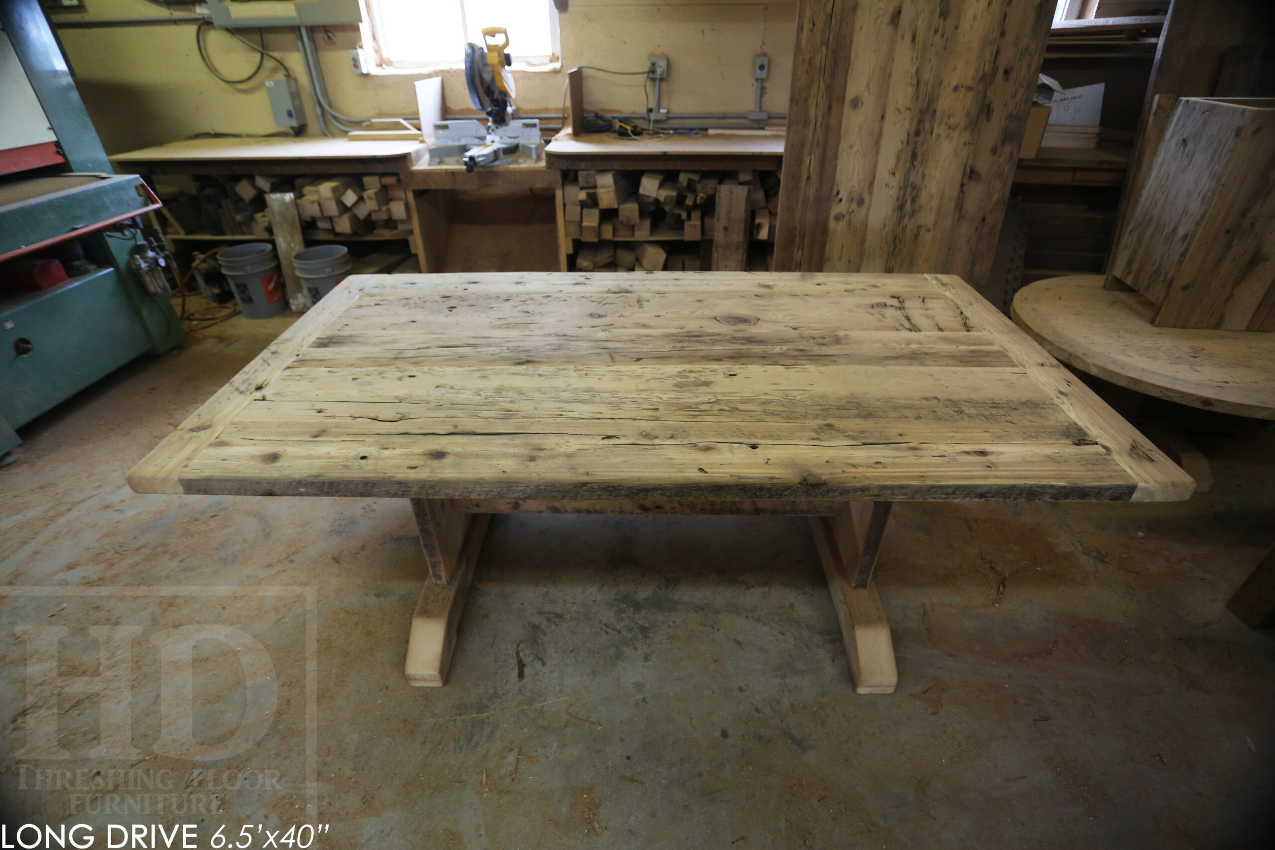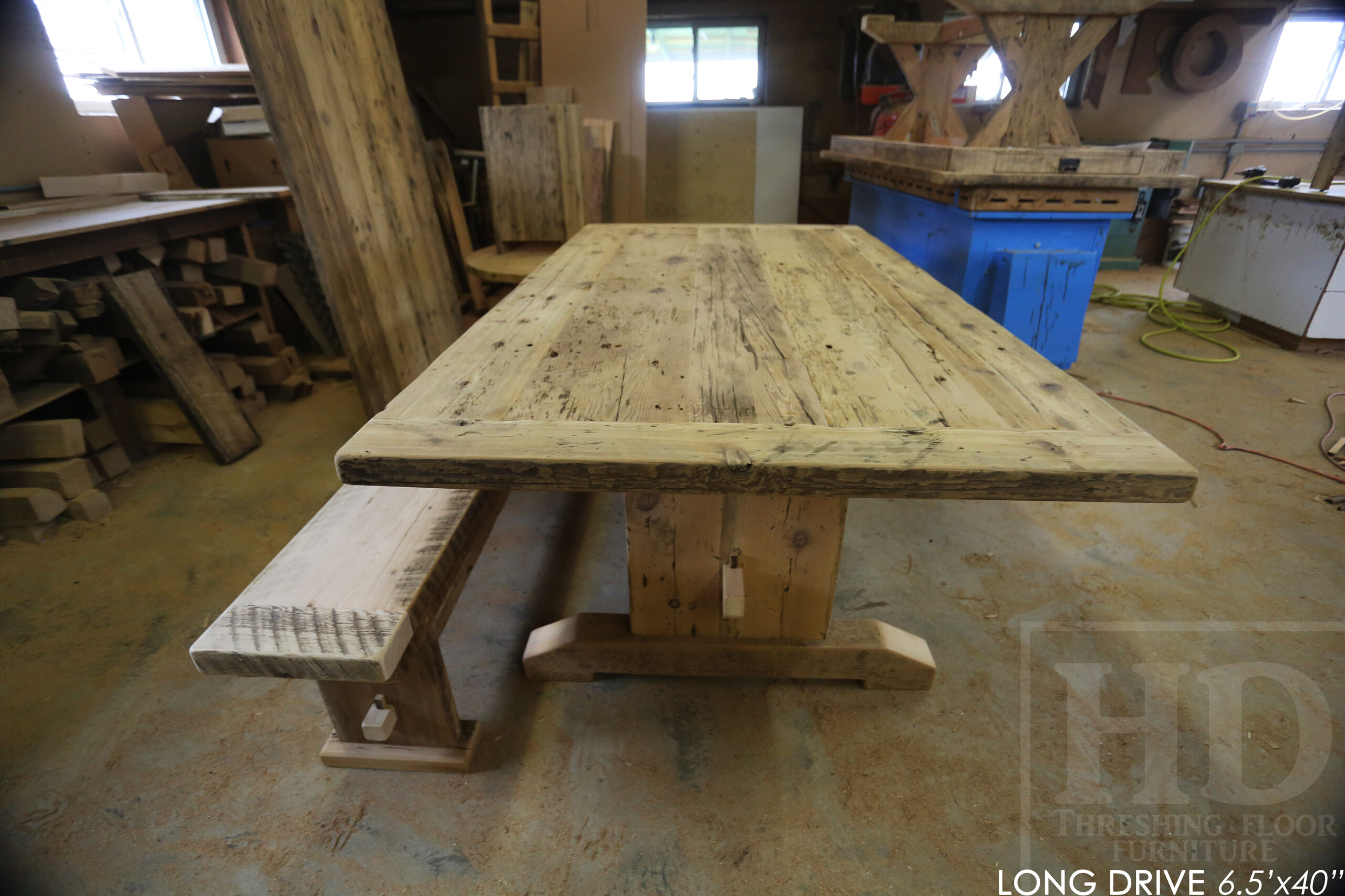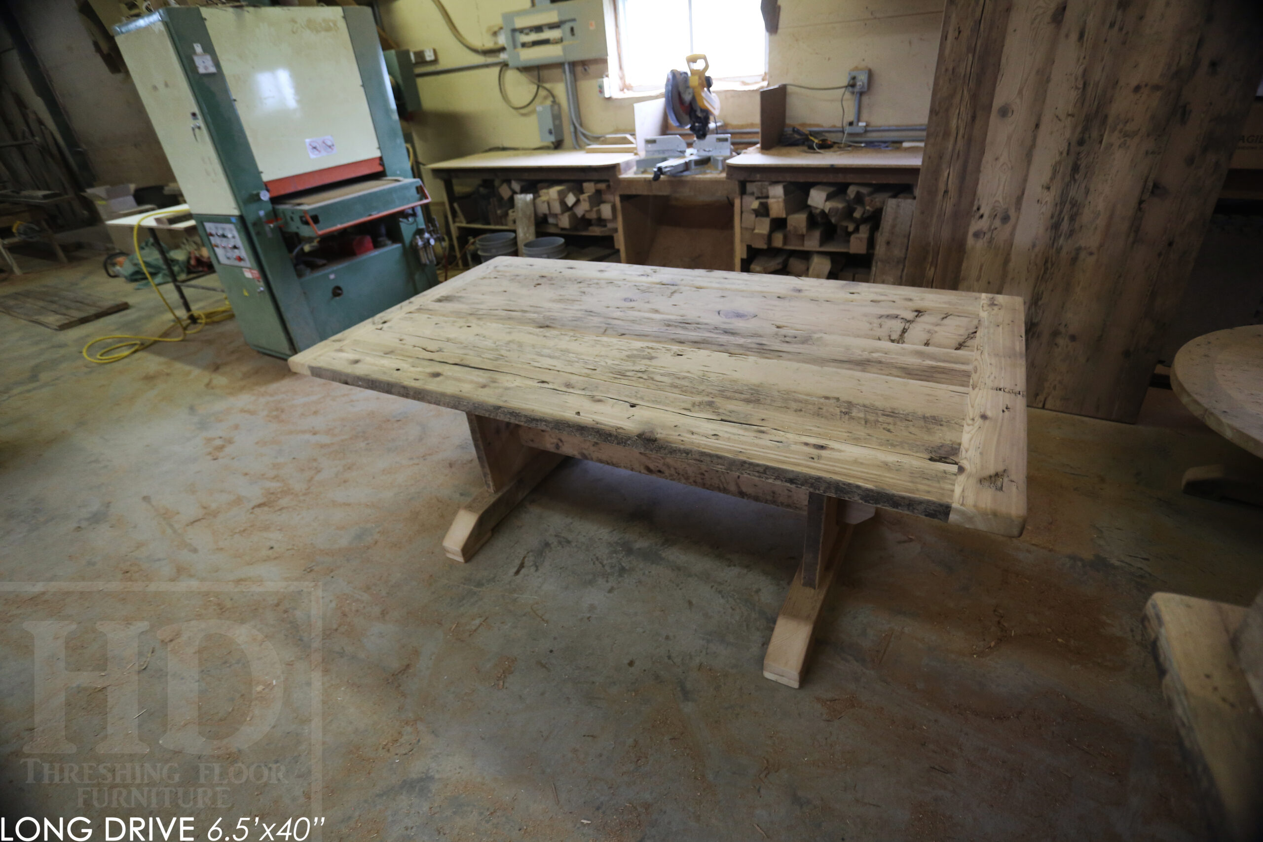 ![6.5' Reclaimed Wood Table for a Burlington home - 42" wide - Trestle Base - Hemlock Threshing Floor Construction / Medium Sanding out of Original Patina - Original edges & distressing maintained - Premium epoxy + satin polyurethane finish - 6.5' [matching] Reclaimed wood bench - 5 Non-arm Ladder Back Chairs - Wormy Maple - Black with sandthroughs frame / seat stained colour of table / www.table.ca](https://www.hdthreshing.dreamhosters.com/blog/blog/wp-content/uploads/2021/08/rustic-reclaimed-wood-table-burlington-ontario-gerald-reinink-22-scaled.jpg)