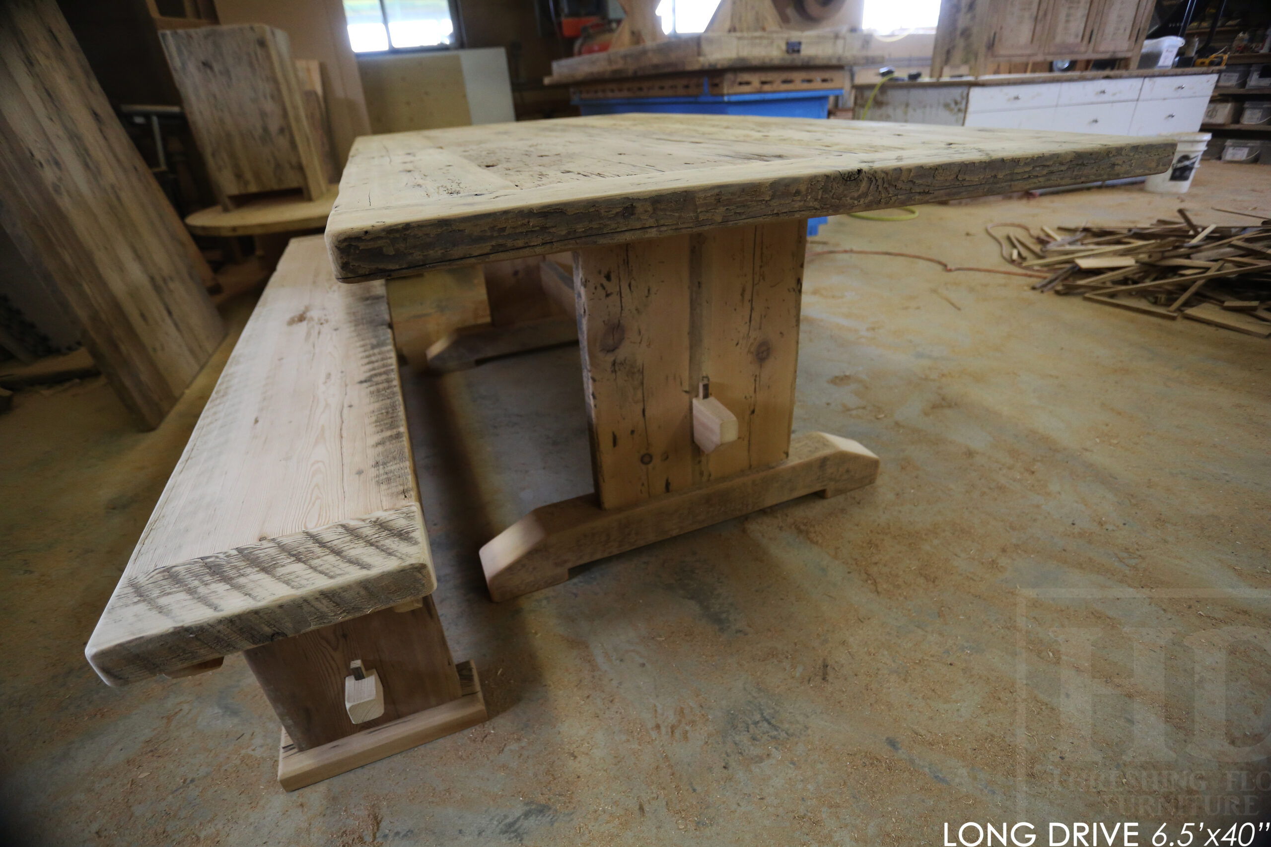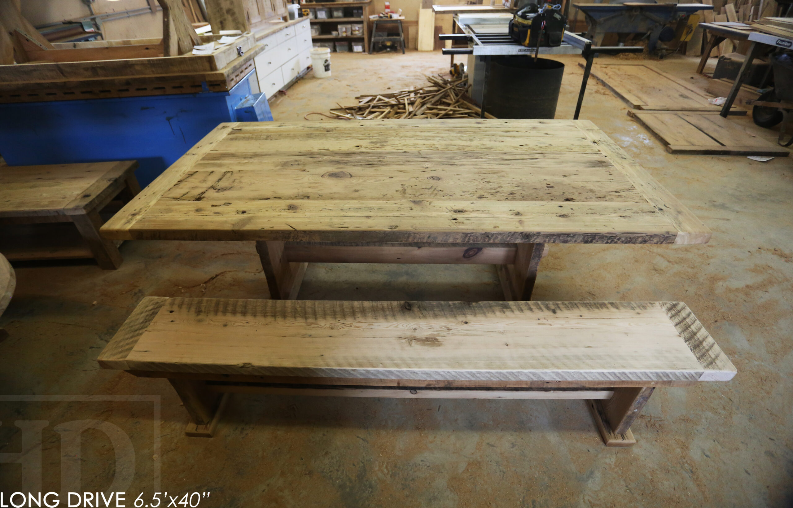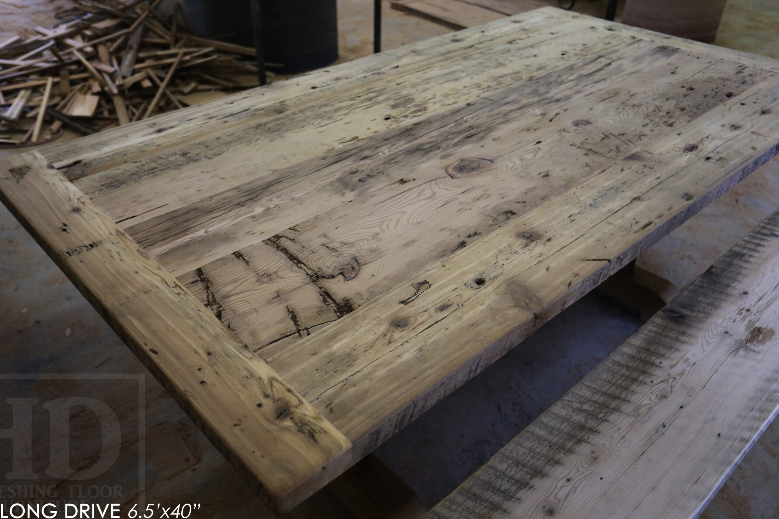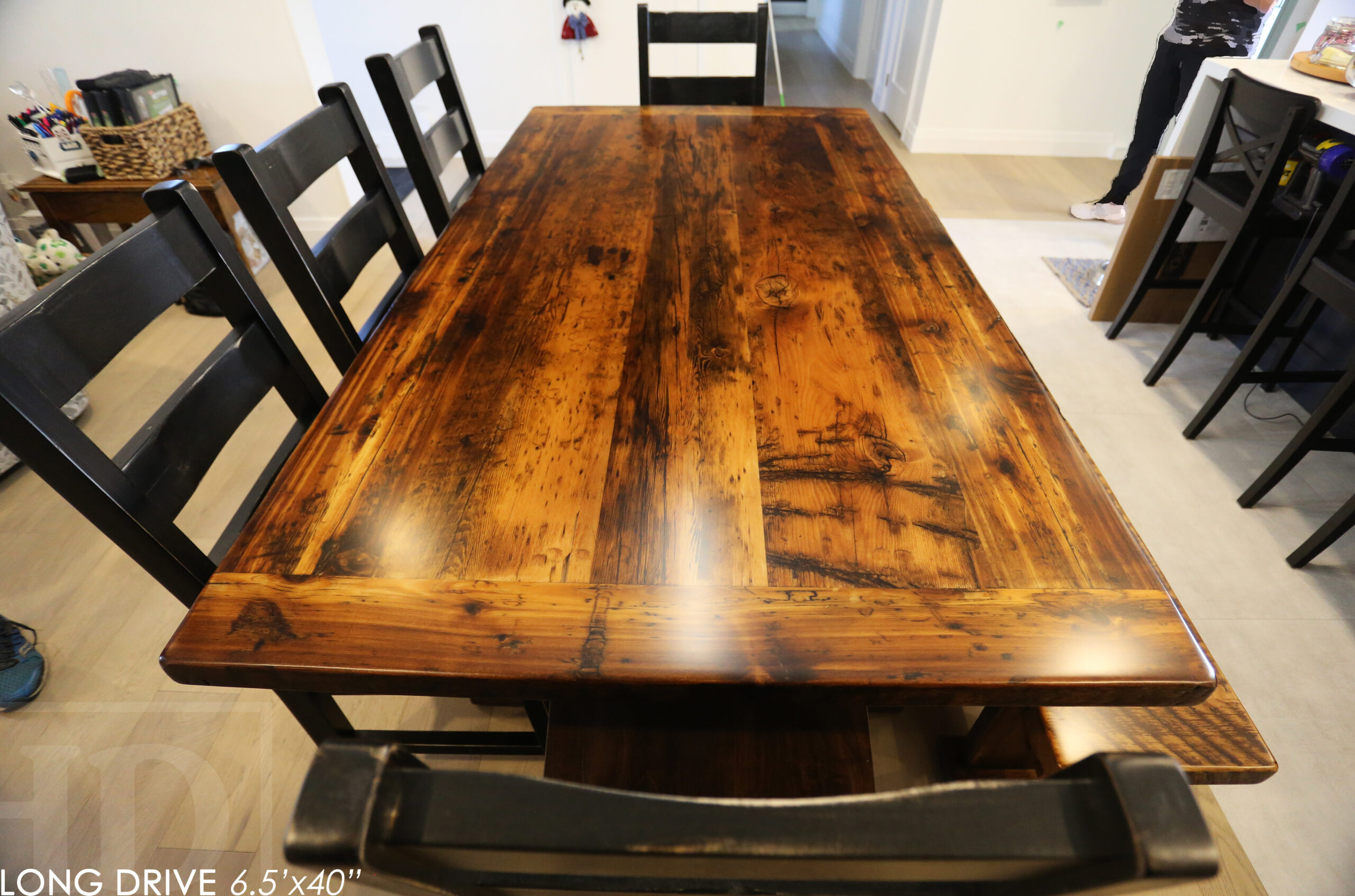 ![6.5' Reclaimed Wood Table for a Burlington home - 42" wide - Trestle Base - Hemlock Threshing Floor Construction / Medium Sanding out of Original Patina - Original edges & distressing maintained - Premium epoxy + satin polyurethane finish - 6.5' [matching] Reclaimed wood bench - 5 Non-arm Ladder Back Chairs - Wormy Maple - Black with sandthroughs frame / seat stained colour of table / www.table.ca](https://www.hdthreshing.dreamhosters.com/blog/blog/wp-content/uploads/2021/08/rustic-reclaimed-wood-table-burlington-ontario-gerald-reinink-22-scaled.jpg)