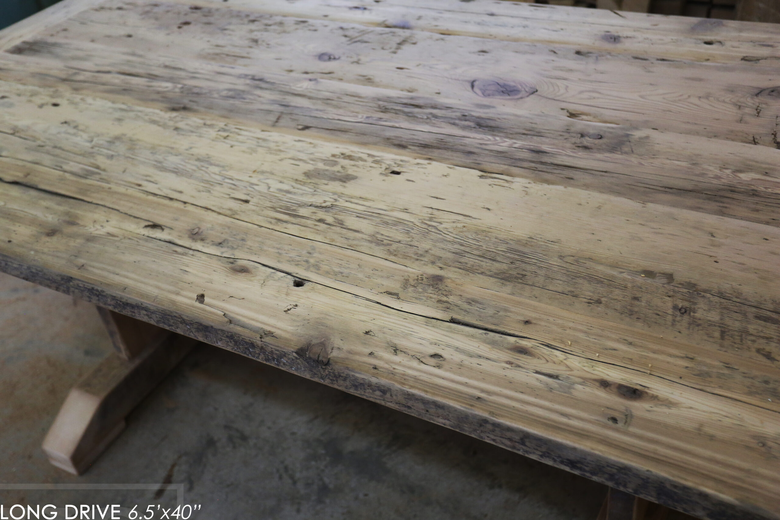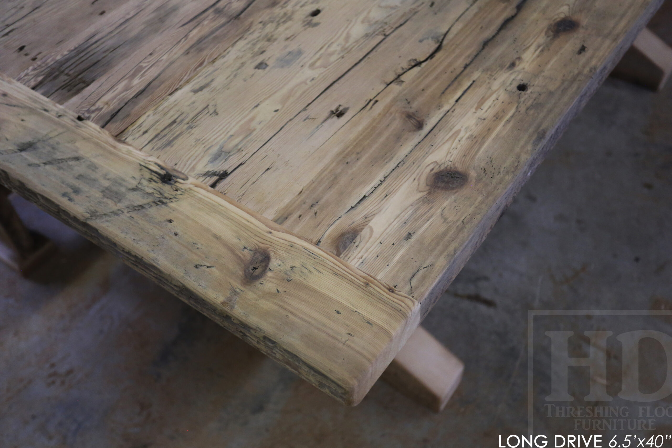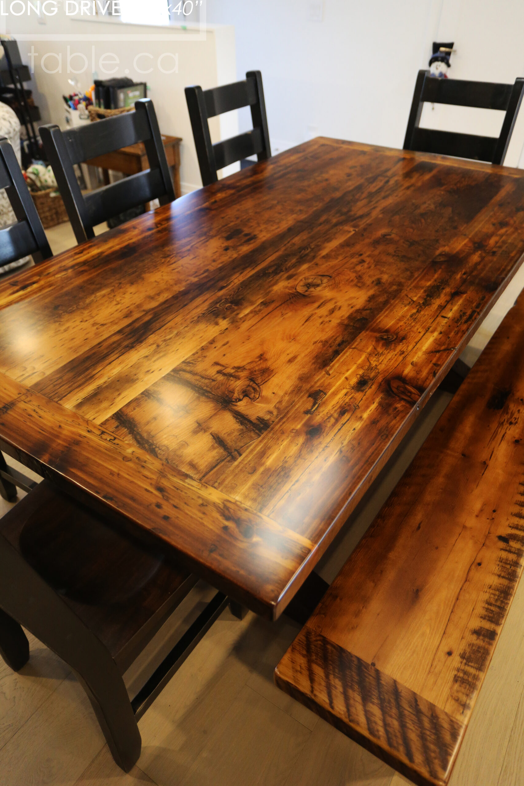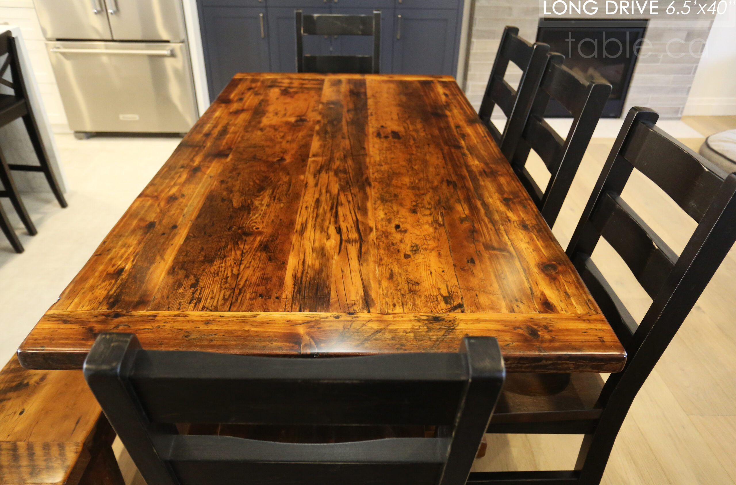 ![6.5' Reclaimed Wood Table for a Burlington home - 42" wide - Trestle Base - Hemlock Threshing Floor Construction / Medium Sanding out of Original Patina - Original edges & distressing maintained - Premium epoxy + satin polyurethane finish - 6.5' [matching] Reclaimed wood bench - 5 Non-arm Ladder Back Chairs - Wormy Maple - Black with sandthroughs frame / seat stained colour of table / www.table.ca](https://www.hdthreshing.dreamhosters.com/blog/blog/wp-content/uploads/2021/08/rustic-reclaimed-wood-table-burlington-ontario-gerald-reinink-22-scaled.jpg)