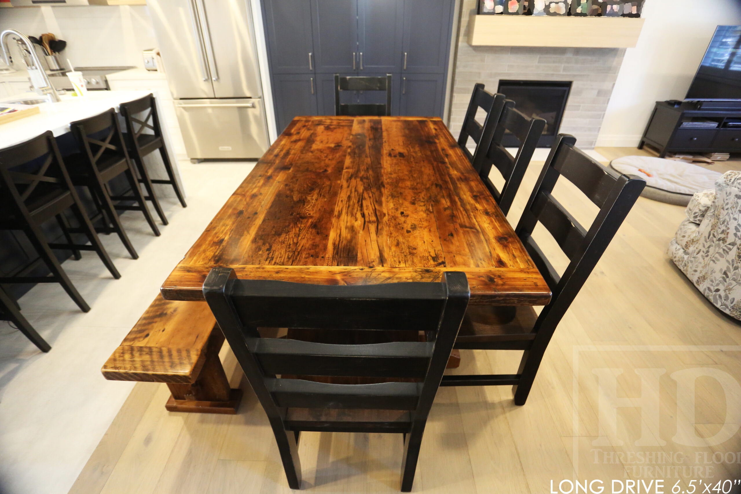 ![6.5' Reclaimed Wood Table for a Burlington home - 42" wide - Trestle Base - Hemlock Threshing Floor Construction / Medium Sanding out of Original Patina - Original edges & distressing maintained - Premium epoxy + satin polyurethane finish - 6.5' [matching] Reclaimed wood bench - 5 Non-arm Ladder Back Chairs - Wormy Maple - Black with sandthroughs frame / seat stained colour of table / www.table.ca](https://www.hdthreshing.dreamhosters.com/blog/blog/wp-content/uploads/2021/08/rustic-reclaimed-wood-table-burlington-ontario-gerald-reinink-17-scaled.jpg)