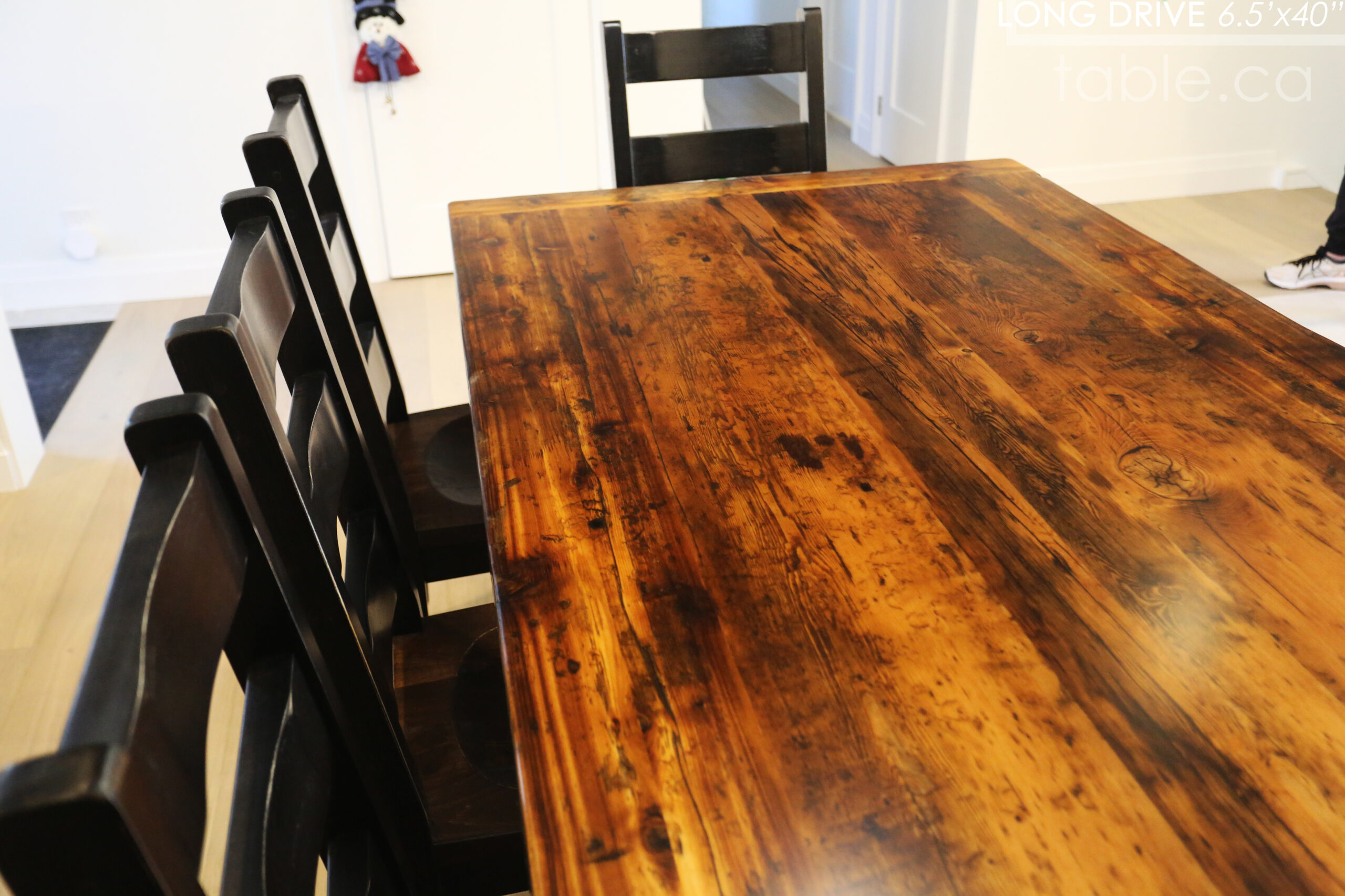 Details/specs: Custom 6.5′ Reclaimed Wood Table for a Burlington home – 42″ wide – Trestle Base – Hemlock Threshing Floor Construction / Medium Sanding out of Original Patina – Original edges & distressing maintained – Premium epoxy + satin polyurethane finish – 6.5′ [matching] Reclaimed wood bench – 5 Non-arm Ladder Back Chairs – Wormy Maple – Black with sandthroughs frame / seat stained colour of table / www.table.ca
